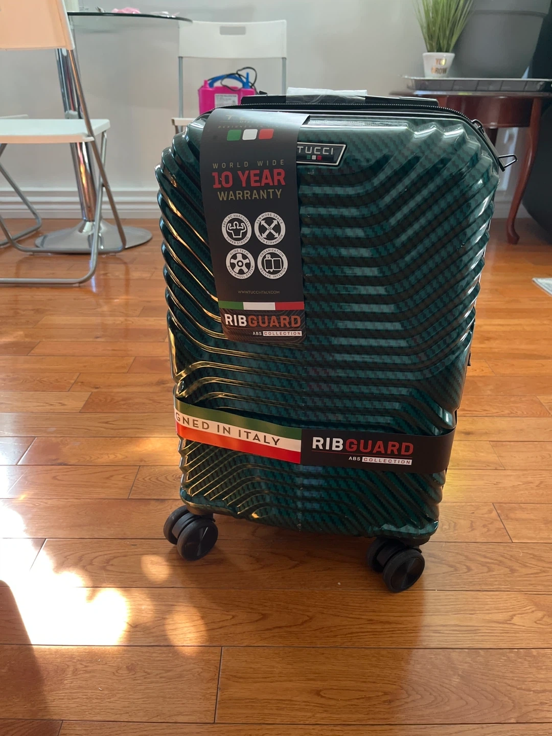 This is a TUCCI Ribguard ABS Collection piece of luggage. It's designed in Italy and comes with a 10-year warranty. The ABS collection offers durability for your travels. Great for weekend trips!