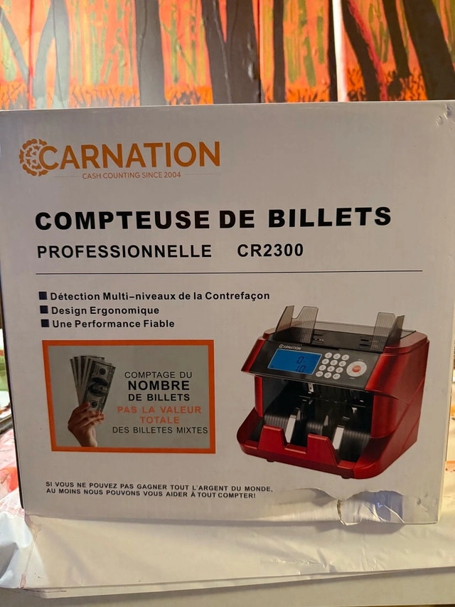 I have 2 brand-new, sealed Carnation CR2300 Professional bill counters for sale. You can buy both for $279, or $159 each. They feature UV, MG, and IR counterfeit detection, count up to 1500 bills per minute, and have a hopper capacity of 500 bills with a 200-bill stacker. Each unit includes an adapter, manual, and accessories. Please note these machines count the number of bills, not the total value. Pickup is in Aurora. Payment accepted is cash or e-transfer upon pickup.