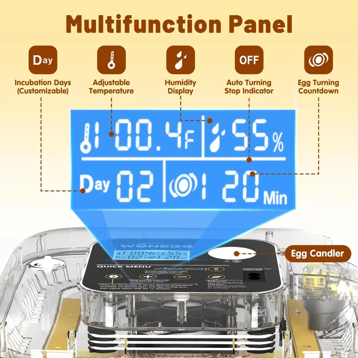 【All-in-One Smart Egg Incubator with Multi-Functional Control Panel】- Featuring a large LCD screen for real-time monitoring of incubation progress, displaying incubation days, temperature, humidity, and egg-turning time.