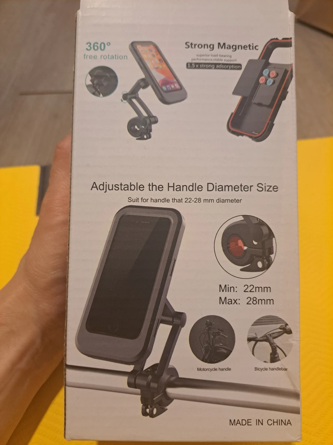 This phone mount offers strong magnetic adsorption and 360° free rotation. It's adjustable to fit handle diameters from 22-28 mm. Suitable for motorcycles and bicycles.