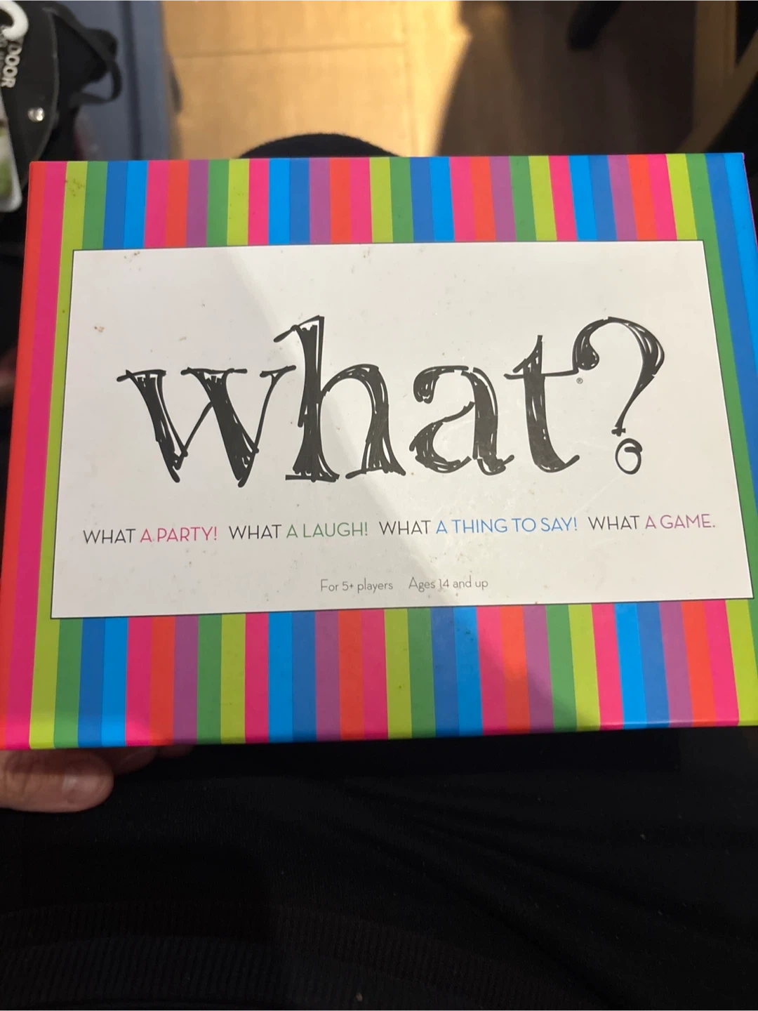Selling the "What?" party game by Outset Media! It's a hilarious game of who-said-what, perfect for get-togethers and parties. For 5+ players, ages 14 and up. Includes 108 cards, answer sheets, score sheets, and 6 pencils