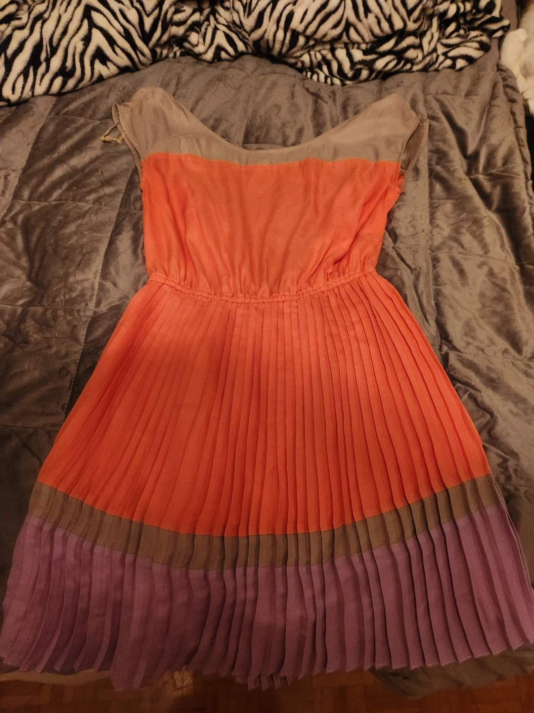 This dress features a colour-block design with pleated detailing. It has a round neckline and a concealed zipper closure at the back. The fabric is lightweight and flowy. If you interested chat with me and I'll give you the meeting spot/my address.
