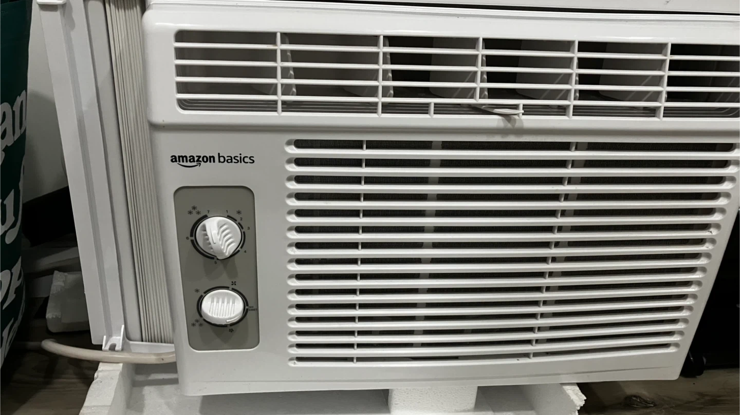 Amazon Basics window air conditioner. It's white and comes with adjustable knobs for temperature and fan speed. Ready to keep your space cool! Amazon Basics 5000-BTU Window Air Conditioner with Quiet Operation, Up to 150 Sqf, Cool and Fan Functions, Washable Filter, Adjustable Window Kit, Intuitive Mechanical Controls, for Small Room, White. Pickup only.