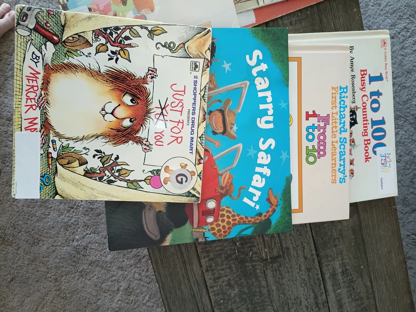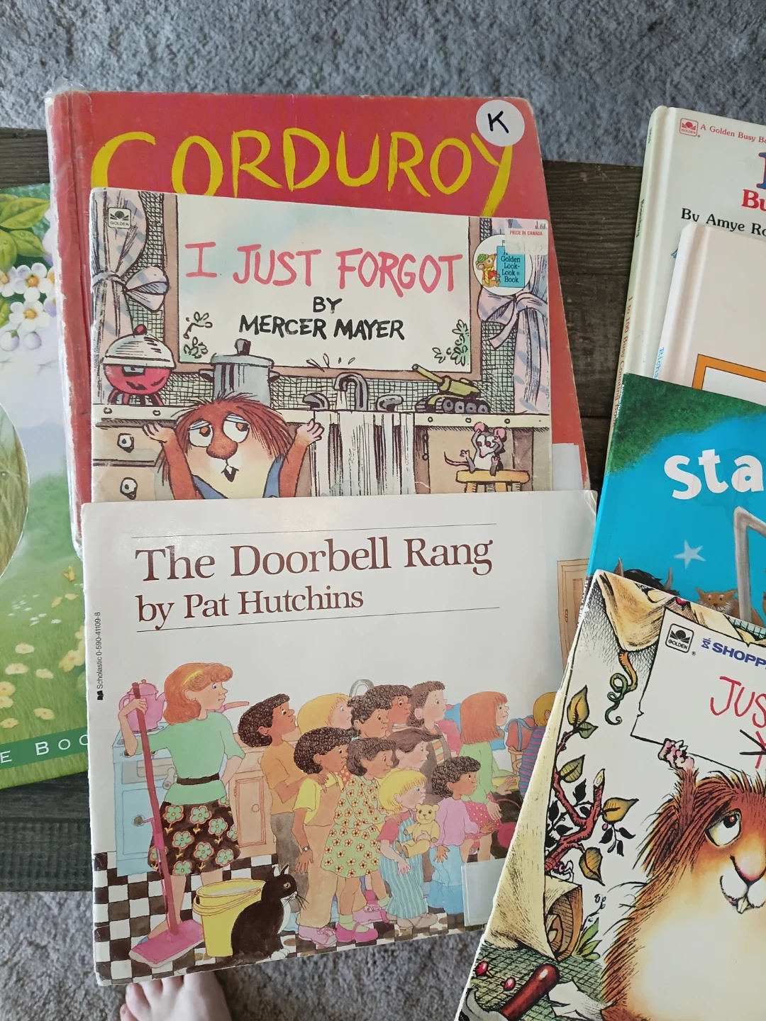 Bundle of popular children's books including 'Stanley the Farmer', 'Rainy-Day Duckling', 'Corduroy', 'I Just Forgot', 'The Doorbell Rang', 'Just For You', 'Starry Safari', and counting books.