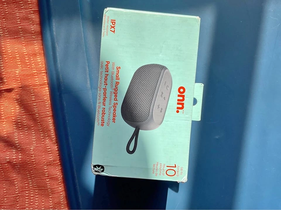 Awesome Onn. small rugged speaker. Still in box, never used. Has Bluetooth wireless tech so you can stream music from your phone. IPX7 waterproof, so good for outdoors or by the pool. Up to 10 hours playtime on a single charge. Also has Party Sync Mode, can pair with other Onn. speakers. Comes in grey. 5W RMS output and 3.5mm Aux In.