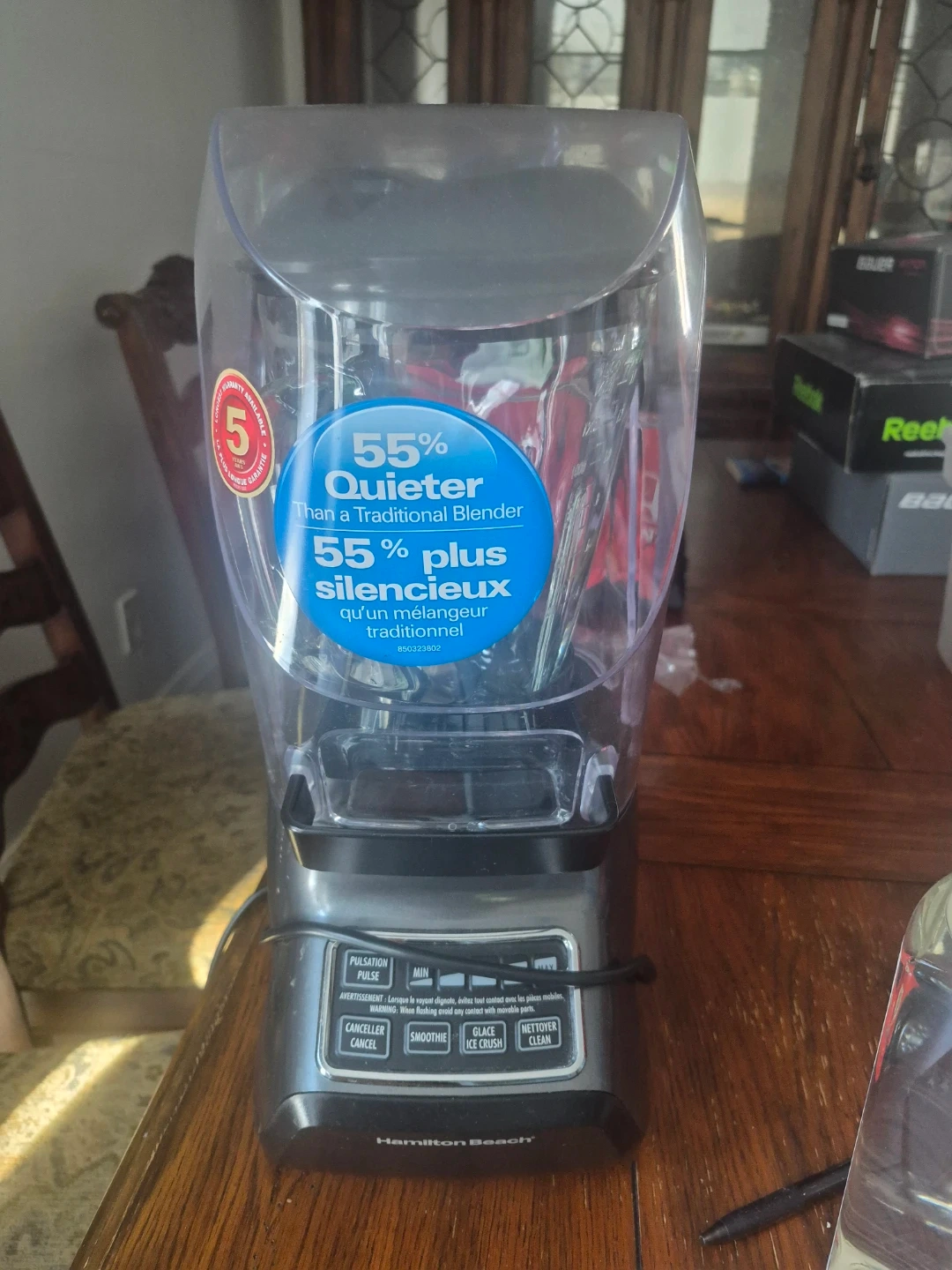 This Hamilton Beach blender is 55% quieter than a traditional blender. It has settings for pulse, min, smoothie, ice crush, and clean. It comes with a 5-year warranty available.