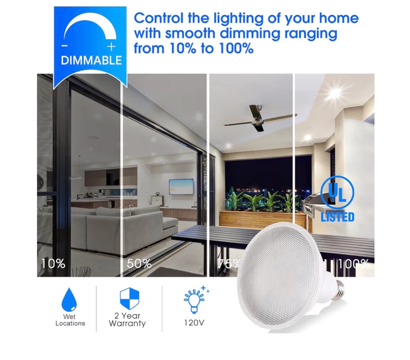 These Energetic outdoor flood lights are 100W equivalent with 1250 lumens brightness. They're dimmable from 10% to 100% and suitable for wet locations. The bulbs have an E26 base and a lifetime of 15,000 hours. This pack includes 12 bulbs.