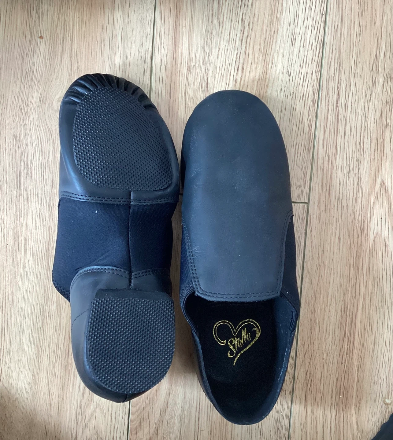 These black jazz dance shoes have a premium leather upper. They're a slip-on style with elastic sides for a snug fit. Size is 4.5 MB. Just didn’t fit sadly.