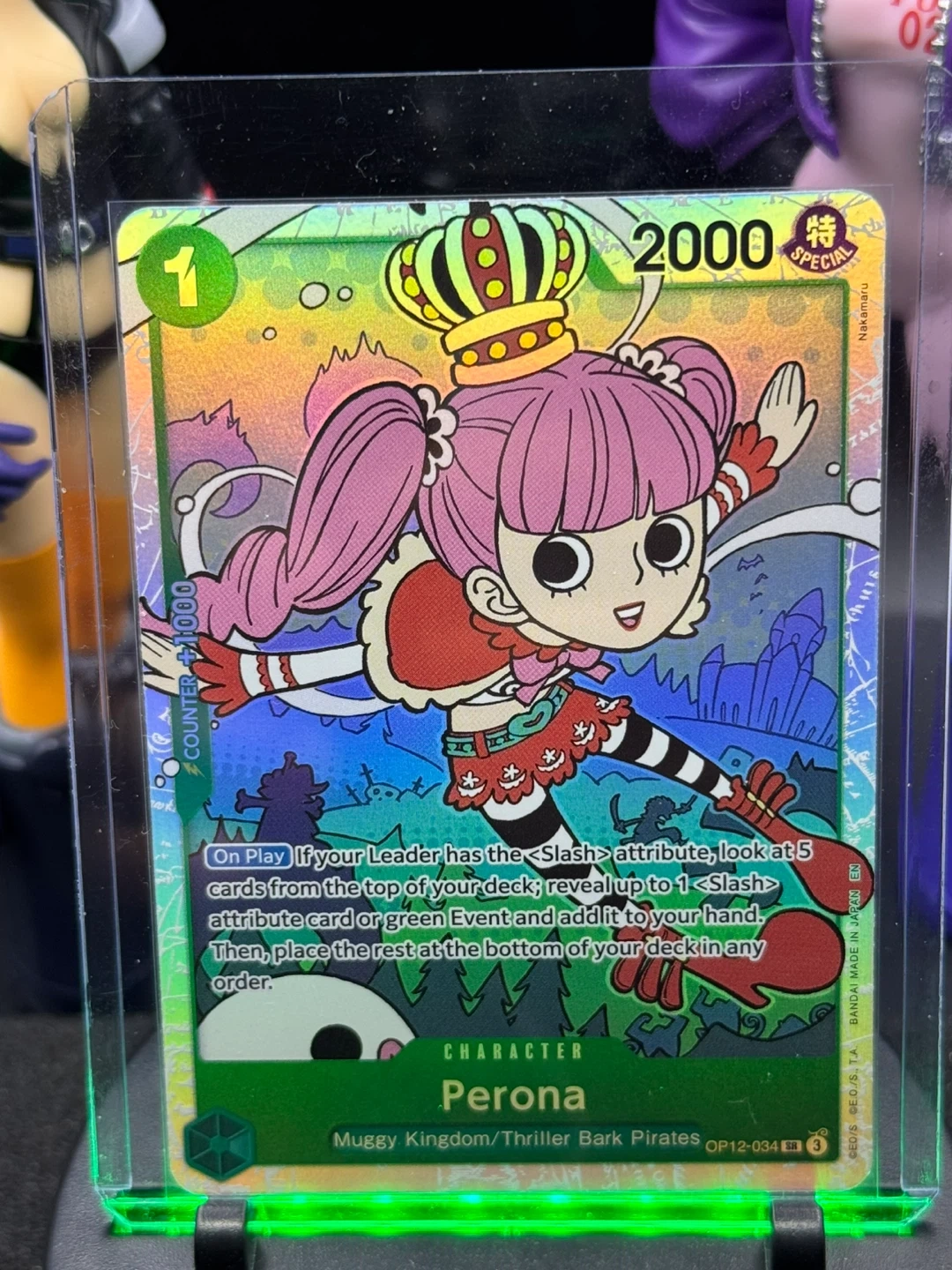 This is a Perona character card from the One Piece Trading Card Game, part of the OP12 set. It's a Special Rare (SR) card with a power of 2000. The card text details an 'On Play' effect involving your Leader's attribute.