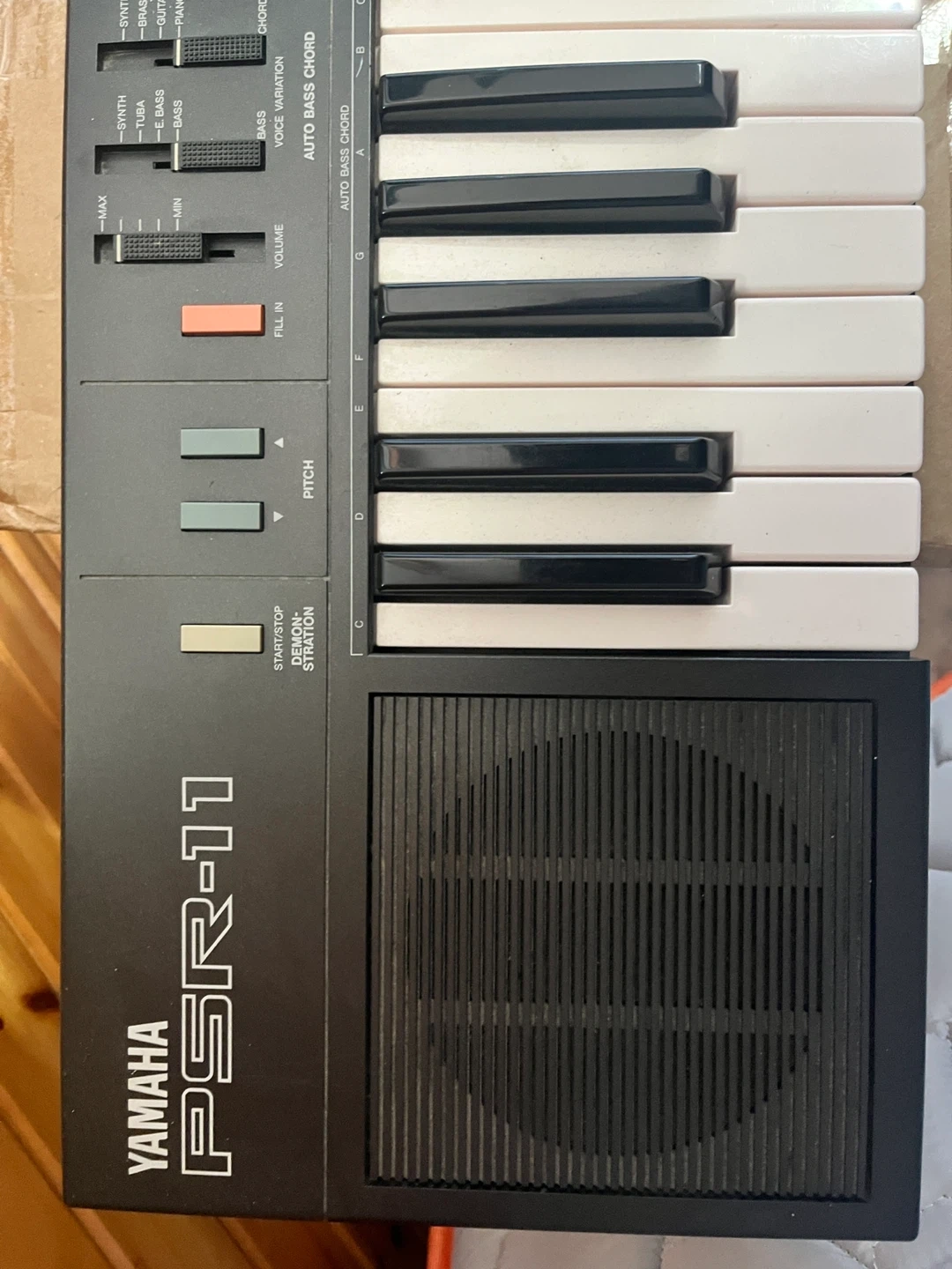 Yamaha PSR-11 portable keyboard with multiple voices and rhythms. Features include auto bass chord and pitch bend. It's great for beginners or for anyone looking for a fun, compact keyboard.