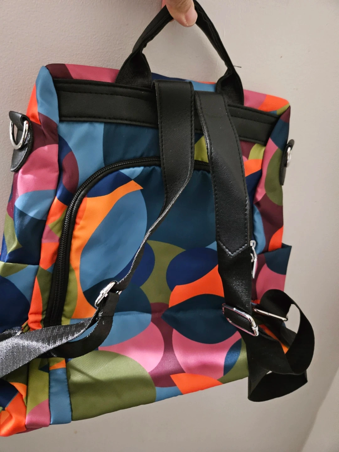 This backpack features a vibrant, colourful geometric pattern. It's made from durable fabric with black faux leather accents. Multiple pockets and adjustable straps for comfort.