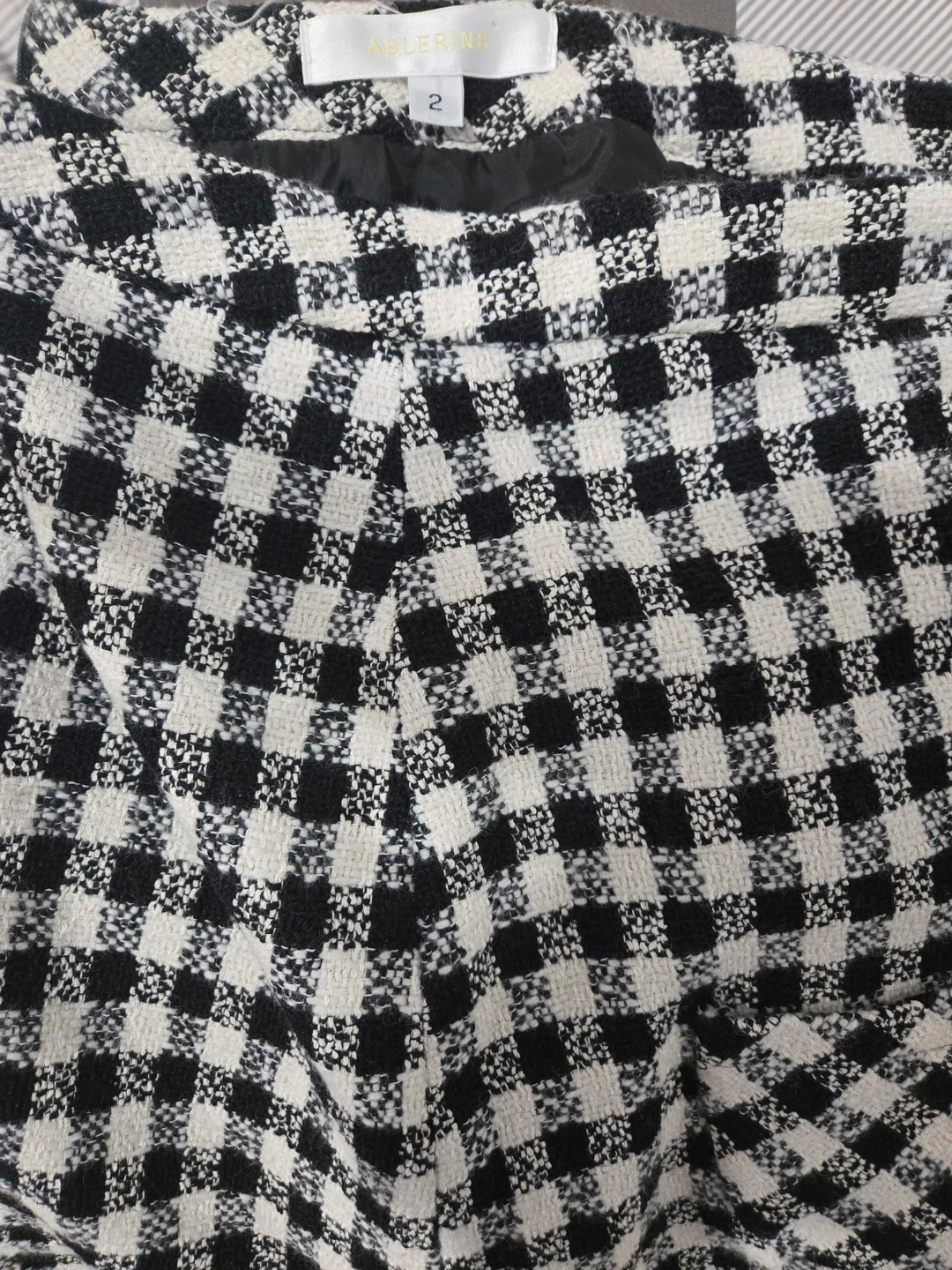 This Aulerink skirt features a classic black and white checkered pattern. It's a size 2 with a textured, tweed-like material. The skirt's design makes it suitable for various occasions.