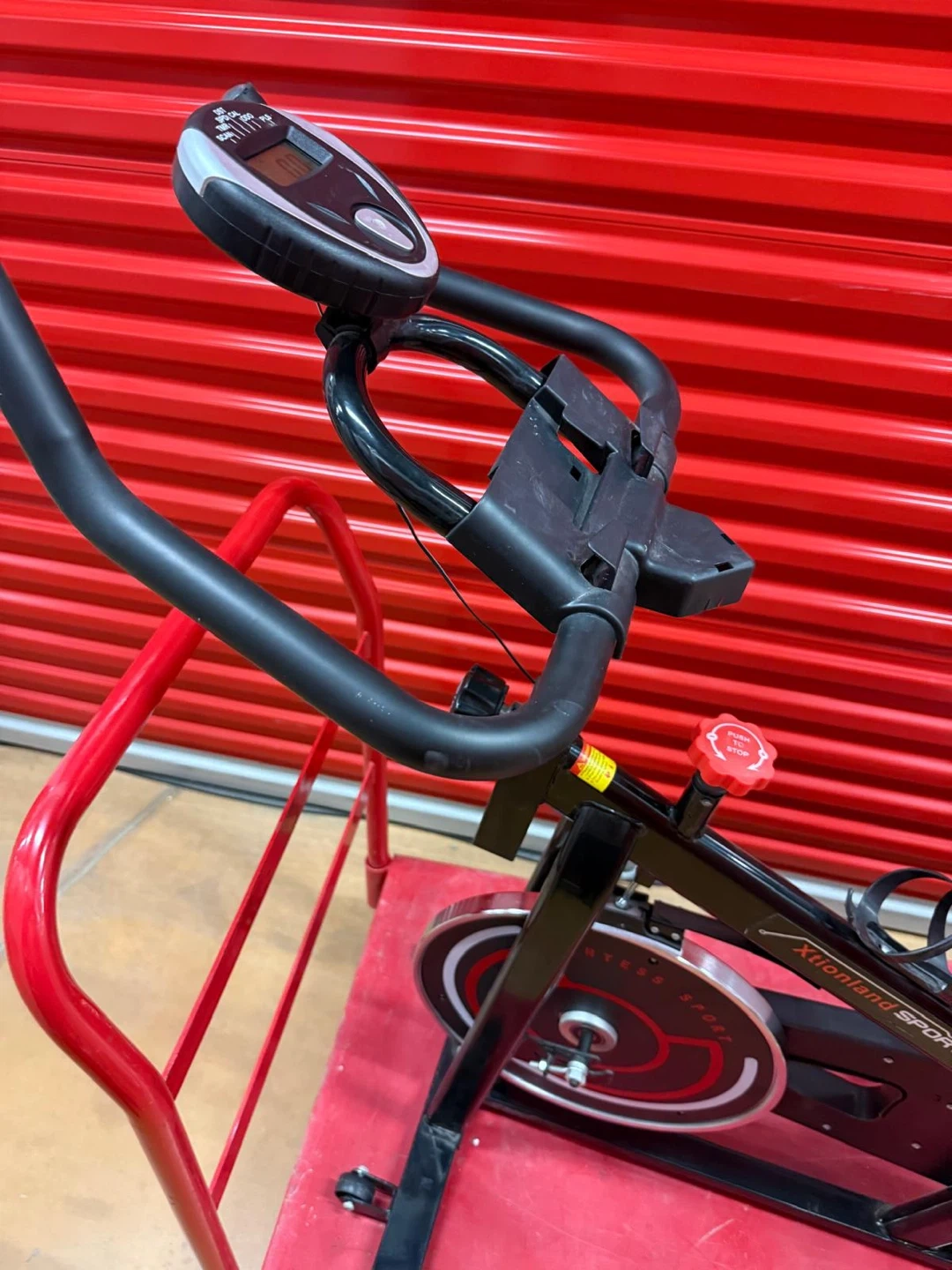 This is an Xtionaland Sport spin bike. It features a digital display for tracking speed, distance, and time. The resistance is adjustable with a red knob. It comes with a water bottle holder.