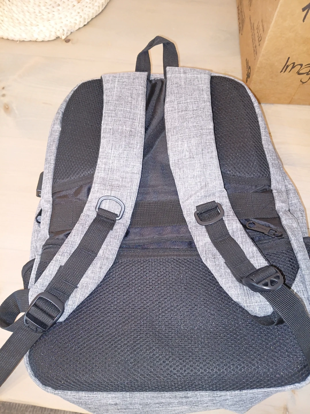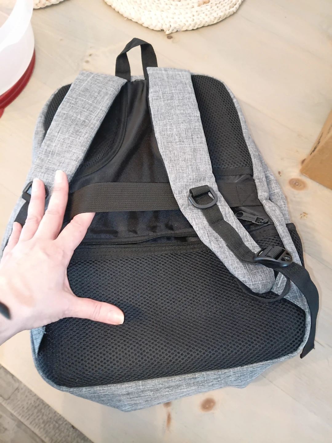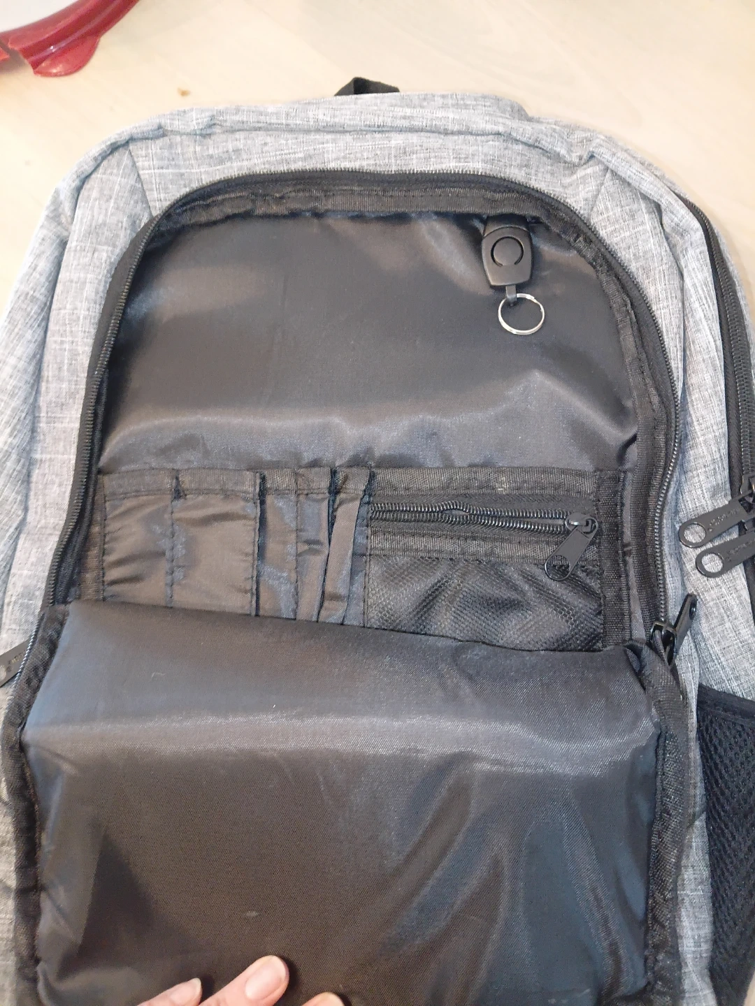 This grey laptop backpack features a spacious main compartment and multiple organizational pockets. (3 main compartments, each with own pockets)