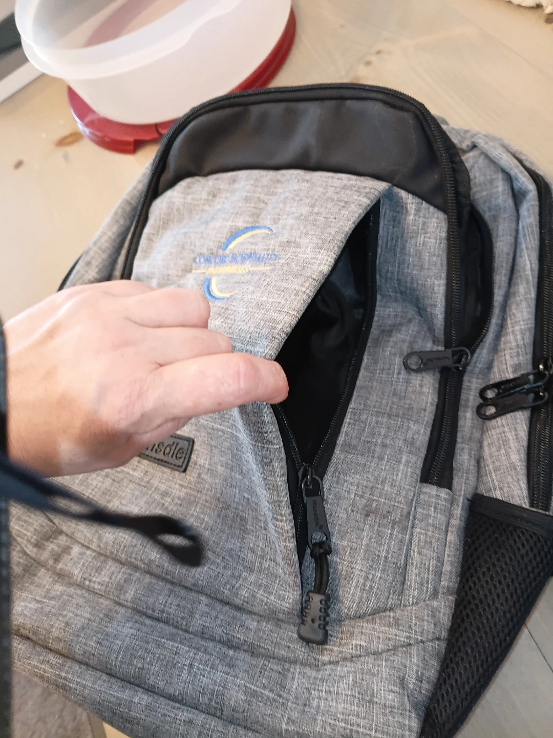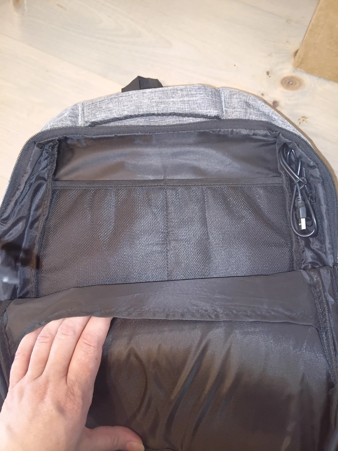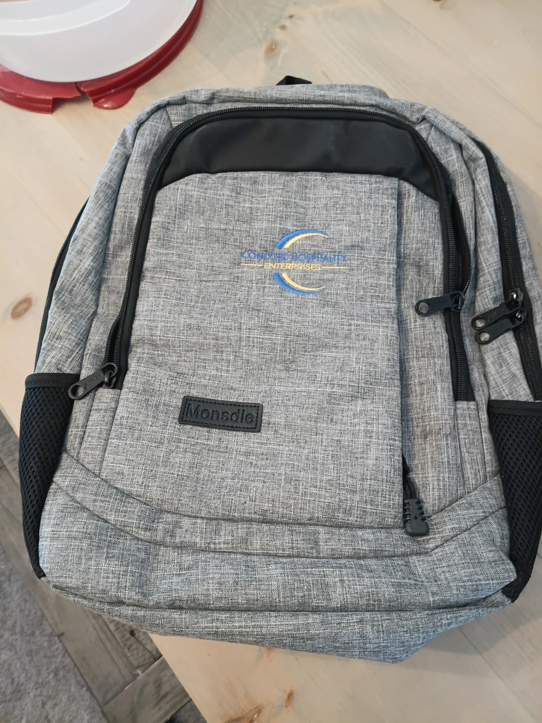 This grey laptop backpack features a spacious main compartment and multiple organizational pockets. (3 main compartments, each with own pockets)