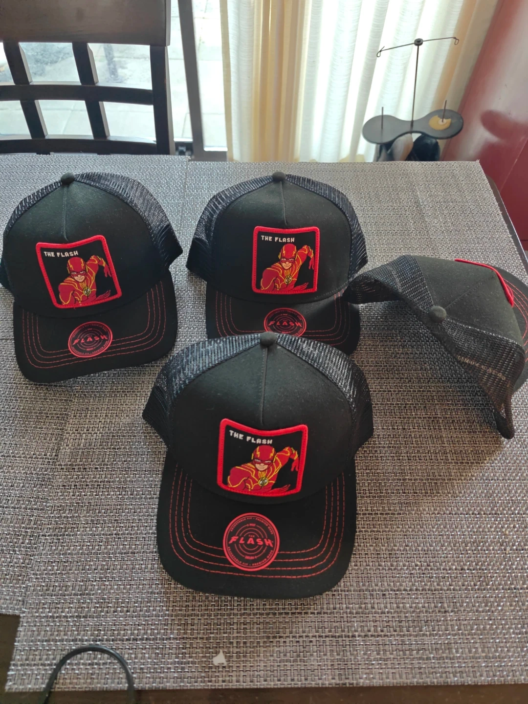 These collectible DC comic THE FLASH, black trucker hats feature a vibrant red embroidered patch. They're designed with a mesh back for breathability and adjustable strap AKA snapback. These hats have never been worn as you can see stored in a storage bag and I currently have four available. Make me an offer