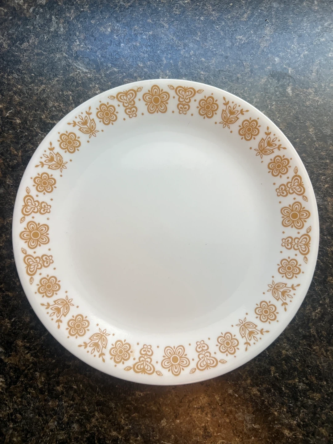 A Corelle plate featuring a delicate golden floral border. It's made from durable, chip-resistant material. This plate is perfect for everyday meals or special occasions!