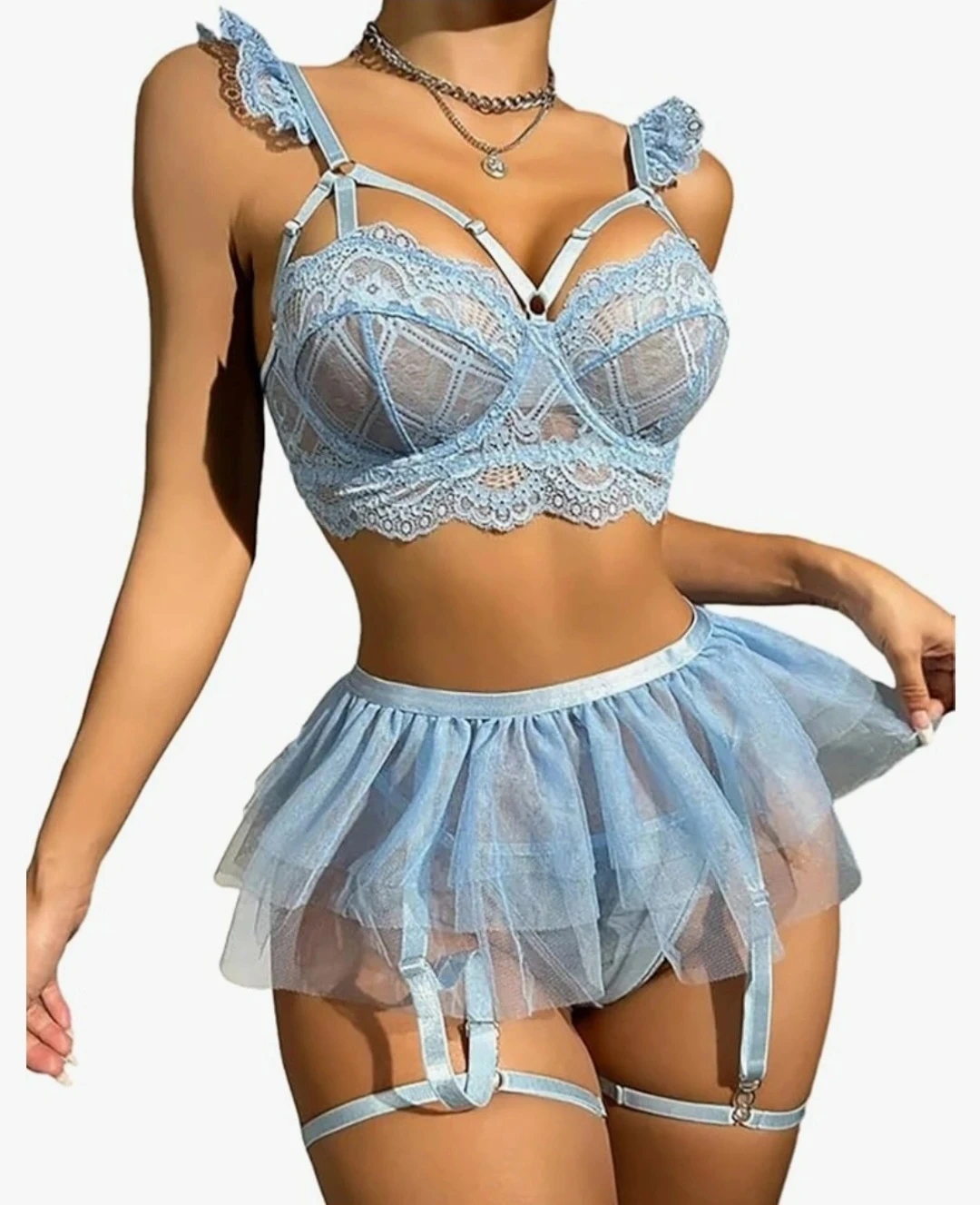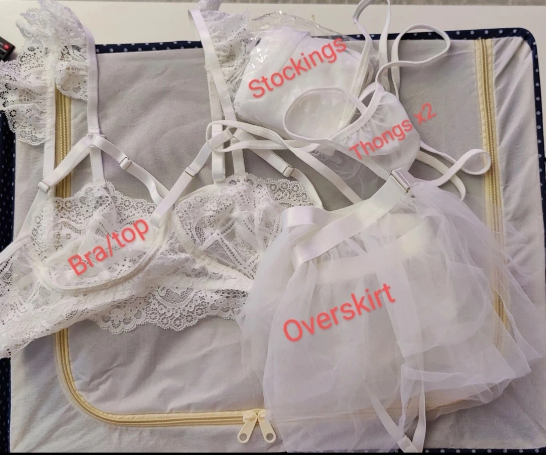 This white lace lingerie set includes a bra top, overskirt, two thongs, and stockings. It's made from delicate lace and mesh fabrics.