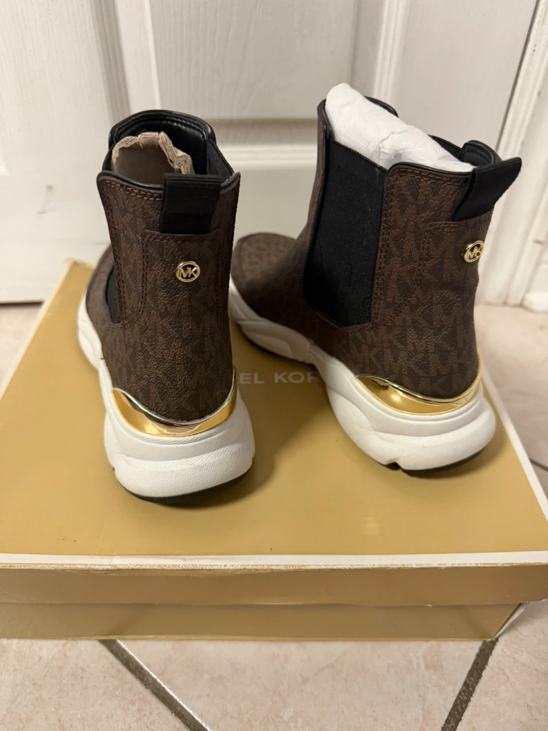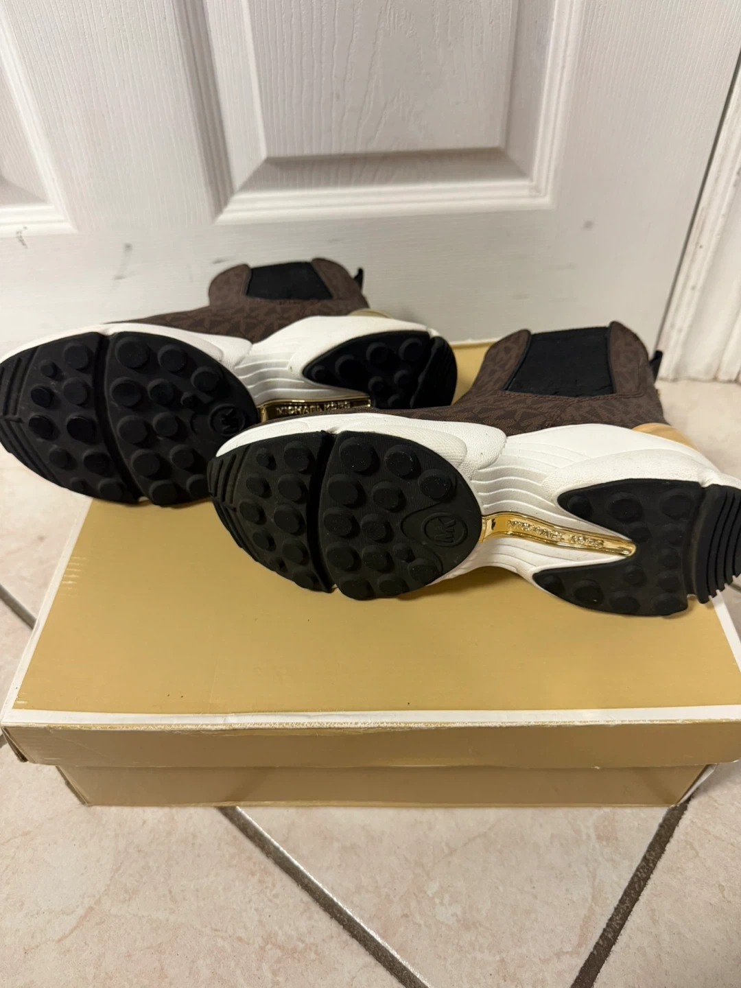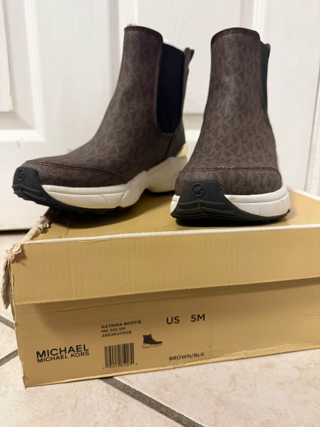 Michael Kors Katrina Bootie in signature brown and black. Size 5M. Features elastic side panels and a white rubber sole with gold accent. Includes original box. rarely been use and you can see from the photos that does not show any folds nor bend near toes area. price is negotiable, low ballers will be ignored. thank you
