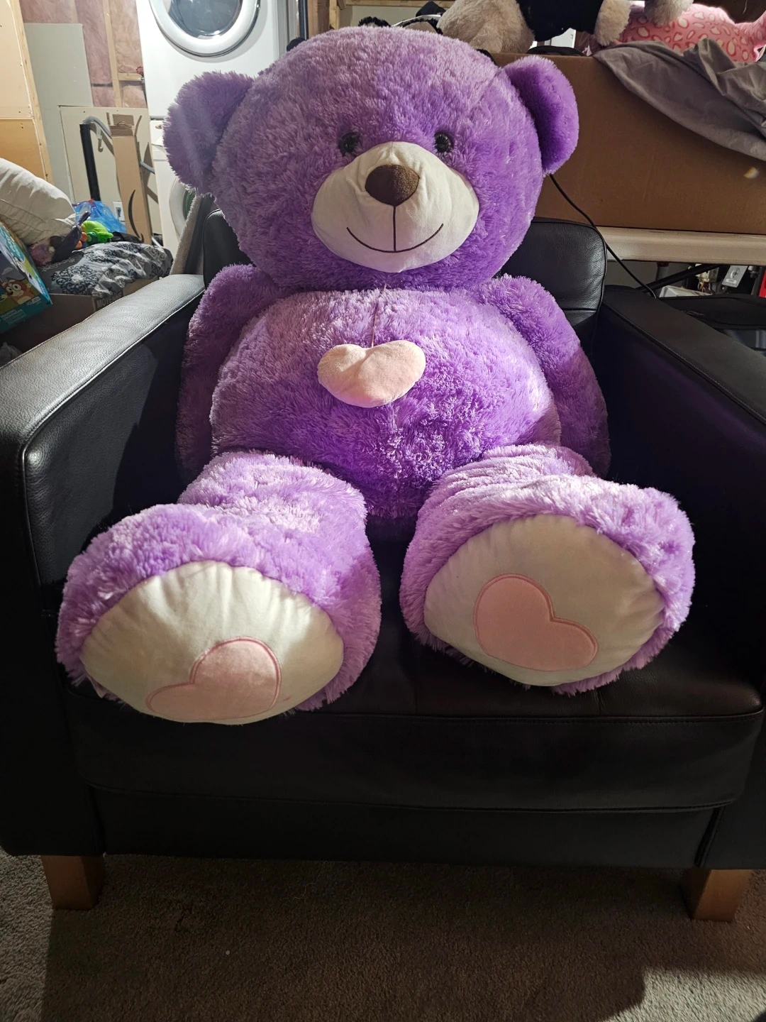 A big, cuddly purple teddy bear with a pink heart on its chest. It has soft, plush fur and a friendly embroidered face. This bear is perfect for hugs and would make a great gift!
