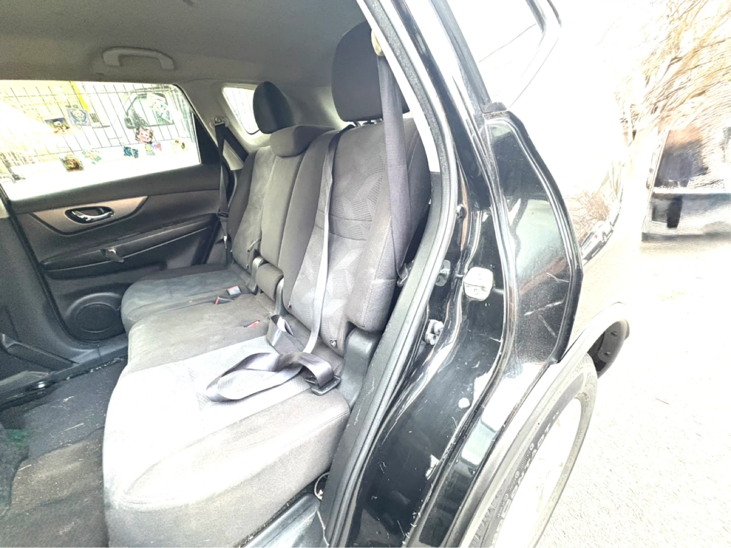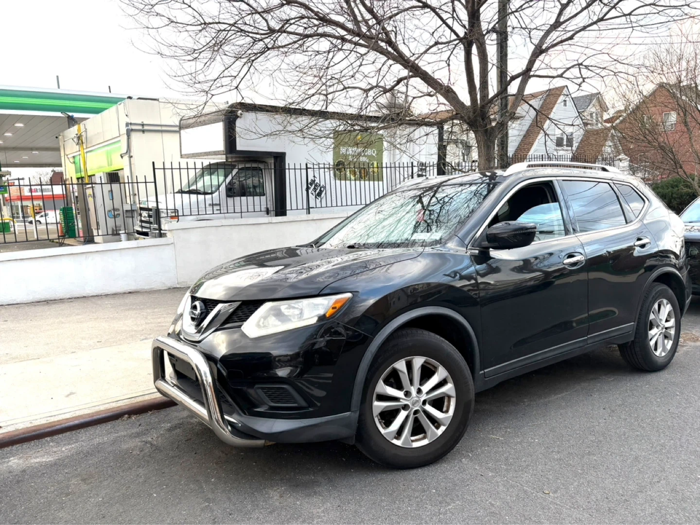 This is a black Nissan Rogue SUV. It features a chrome bull bar on the front for added protection. The vehicle has alloy wheels and a rear spoiler.