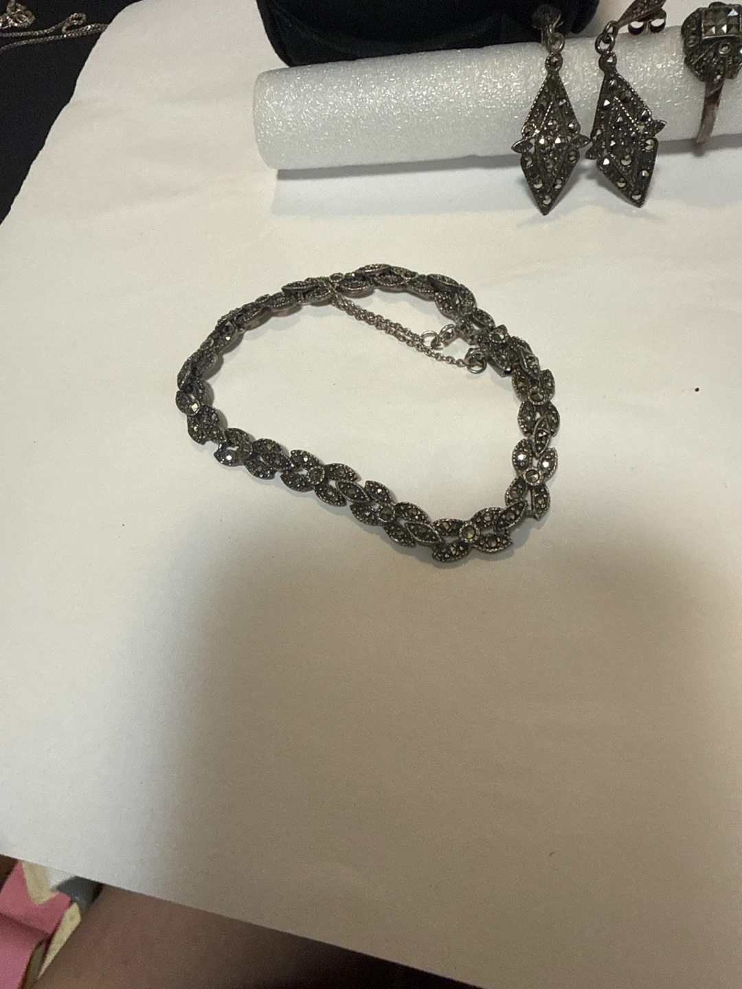 Beautiful vintage bracelet with intricate marcasite detailing. It's a delicate piece with a silver-tone chain and clasp. This bracelet adds a touch of old-world charm to any outfit!