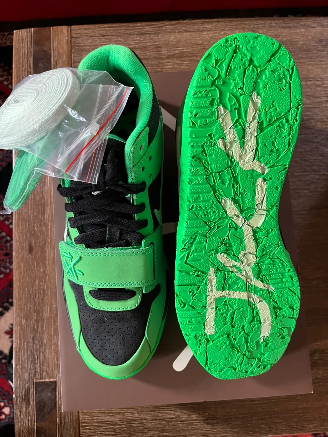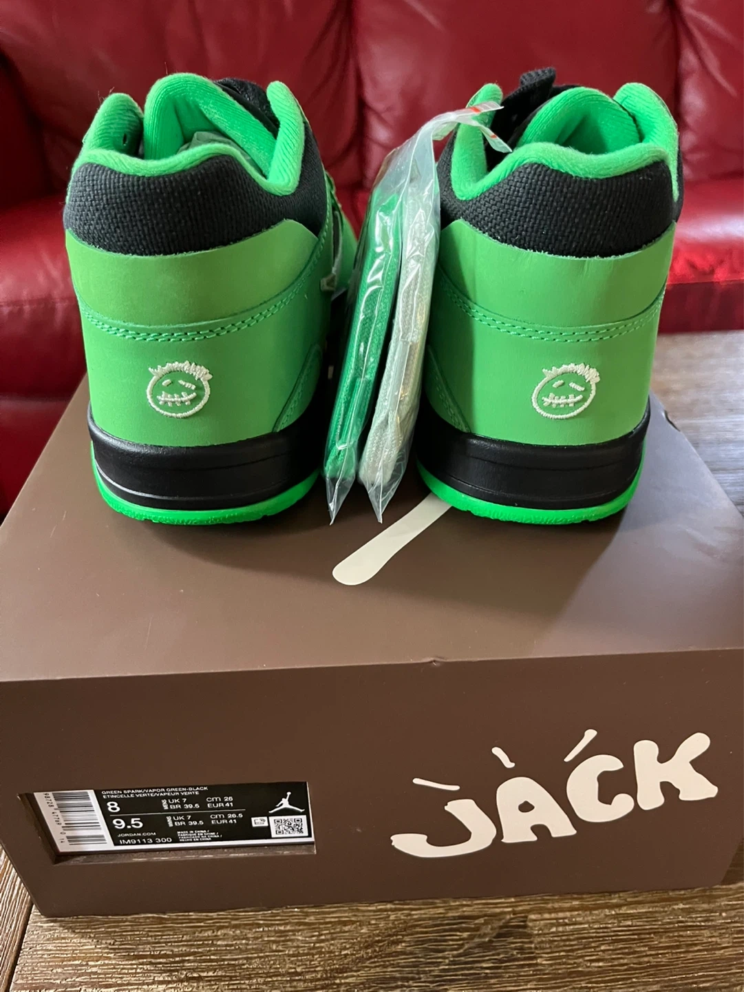 Fresh Jordan Travis Scott Jumpman Jack sneakers. New in box with original tissue paper and extra laces. Comes with both light green and dark green laces. The 'Jack' graphic on the shoes is known to wear off with use over time, just so you know. Super clean, never worn.