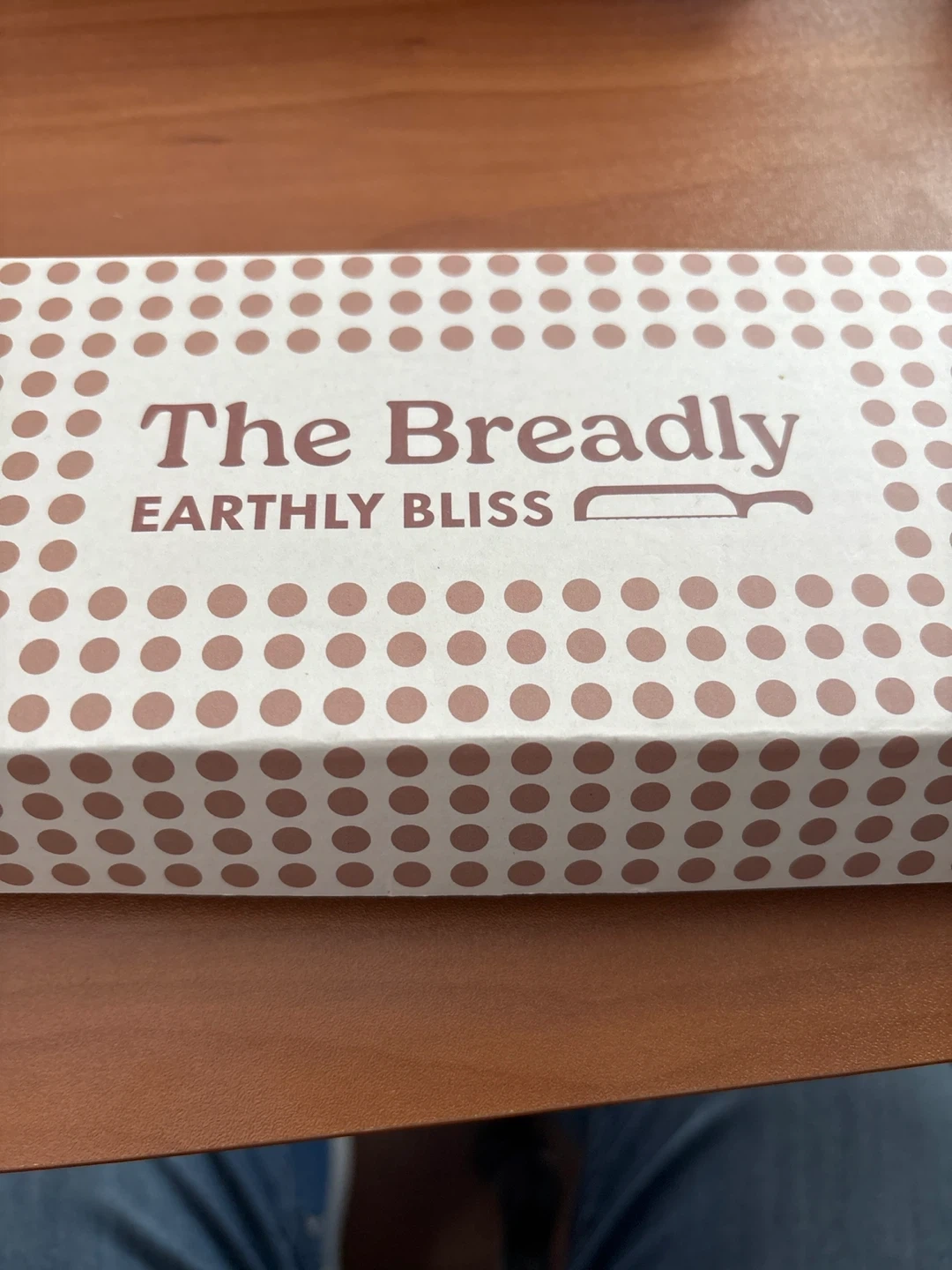 This is The Breadly "Earthly Bliss" bread knife. It features a serrated stainless steel blade and a smooth wooden handle. It's great for slicing loaves of bread evenly and comes with an extra blade. Never used.