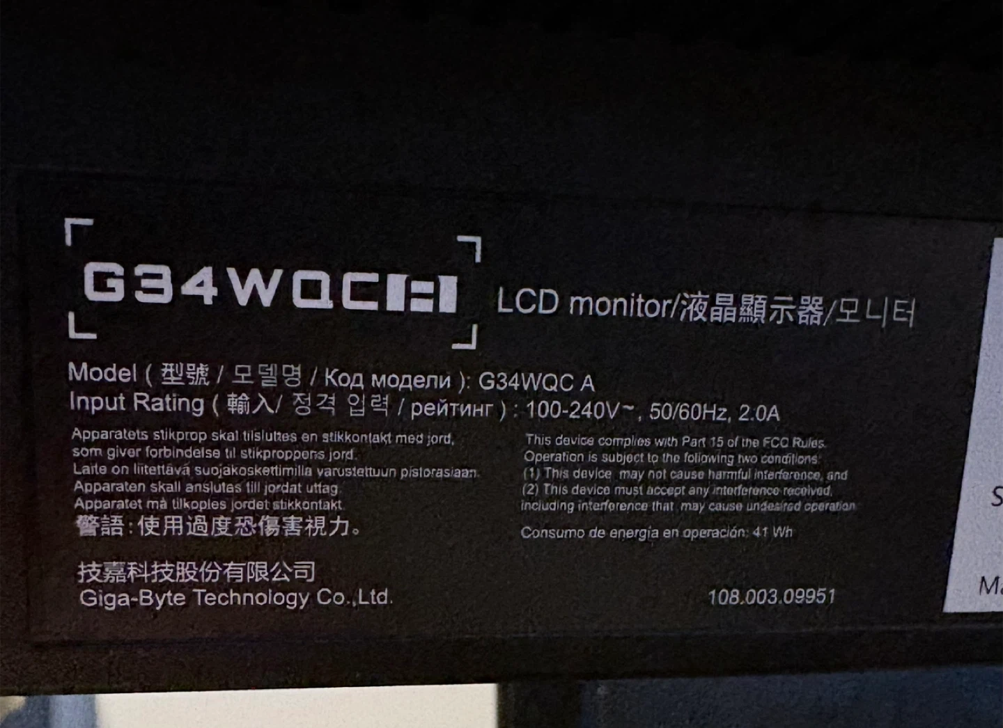 This is a Gigabyte G34WQC A curved LCD monitor. It has an input rating of 100-240V, 50/60Hz, 2.0A. It features multiple HDMI ports for connectivity. Perfect for immersive gaming and media viewing!