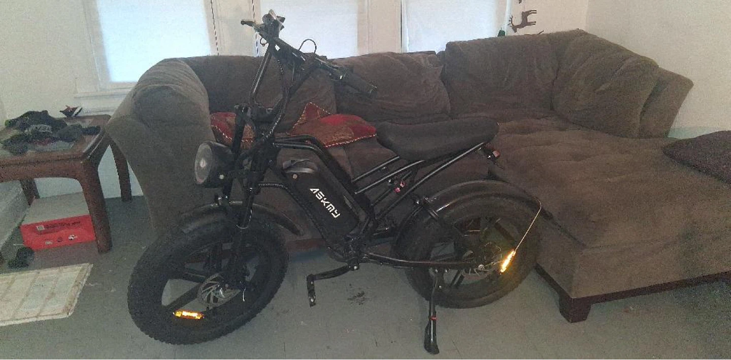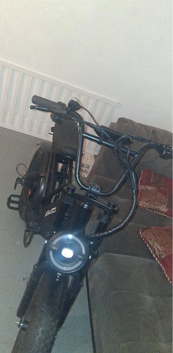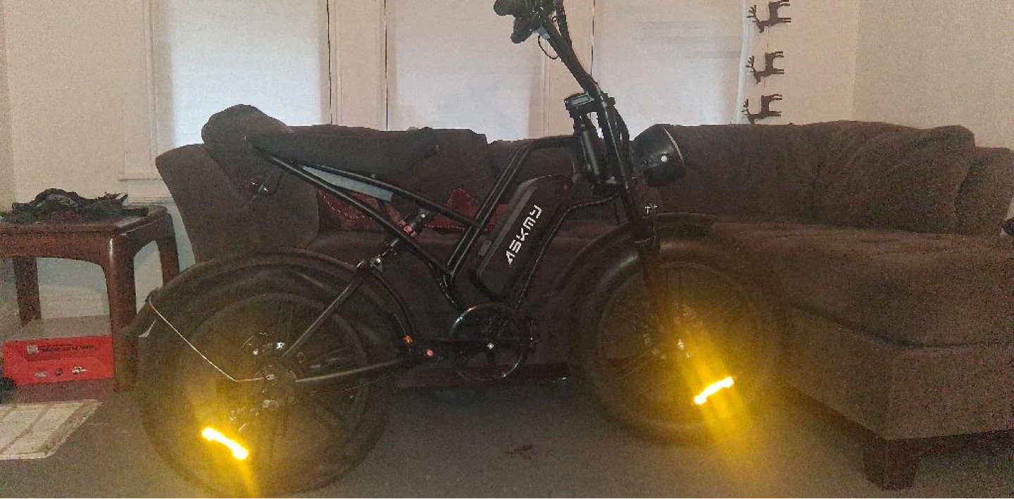 This is an ASKMY electric fat tire bike. It has a black frame and thick tires for stability. This bike is great for cruising around town or off road it’s brand NEWI just have the back tire popped and have no car to take it to a nearby shop runs 35pmh max speed