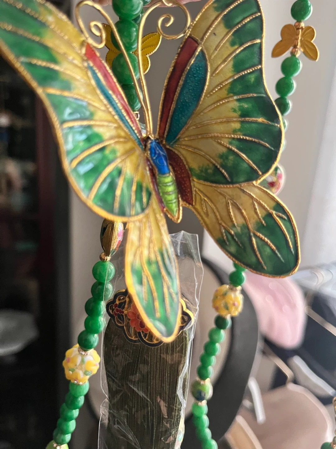 China ICH. Beautiful decorative butterfly charm with intricate enamel work and green jade-like beaded tassels. It's a lovely accent piece. This charm adds a touch of elegance to any setting.