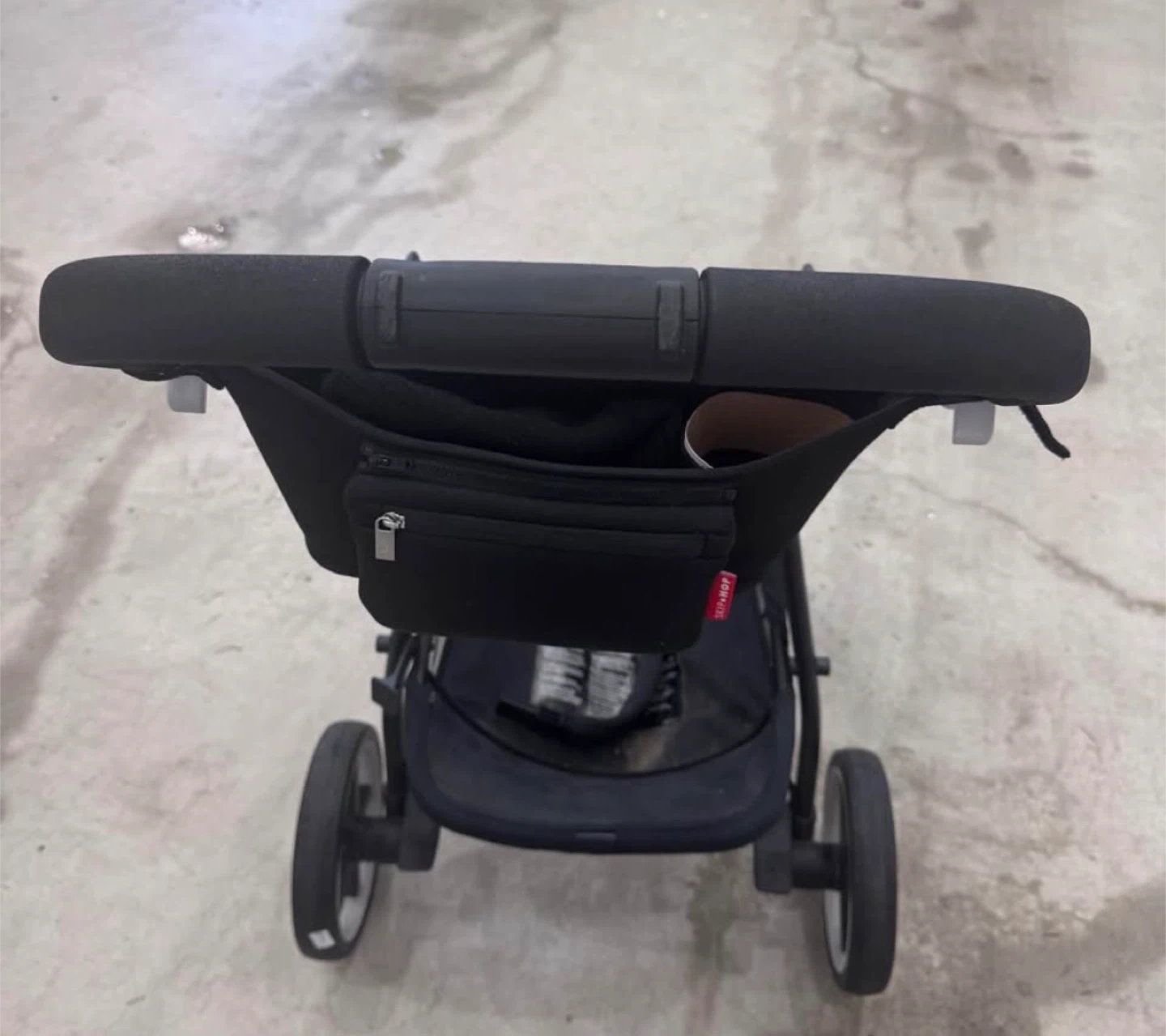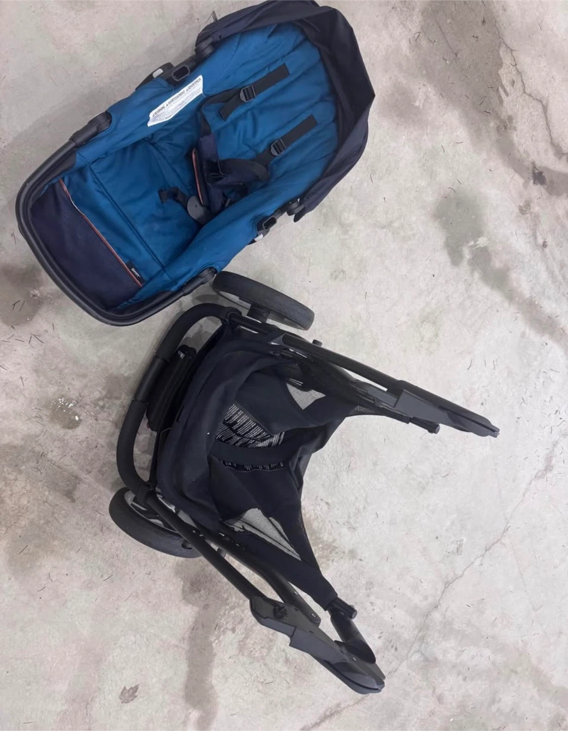 This is an UPPAbaby Vista stroller seat with a blue liner. It's a lightweight and comfortable option for your little one. The seat reclines for naps on the go!