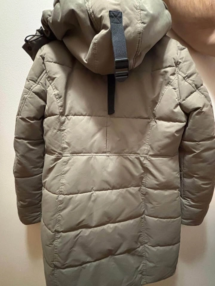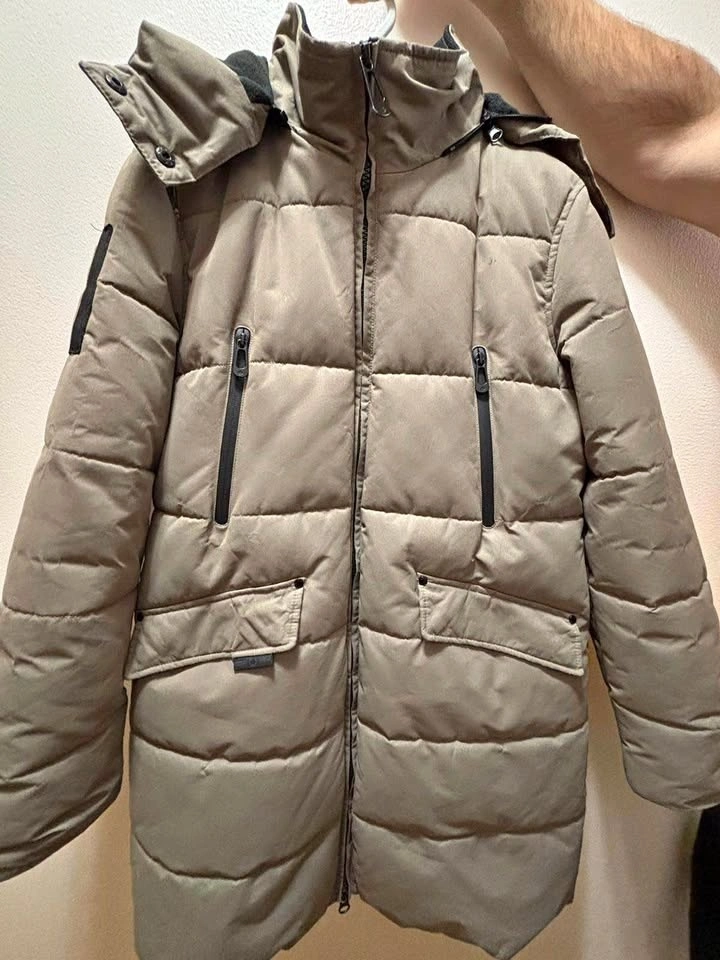 Warm puffer jacket with a cozy hood and plenty of pockets, including two zippered on the chest and two flap pockets on the lower front. Great for chilly days. Color is a neutral khaki/tan.