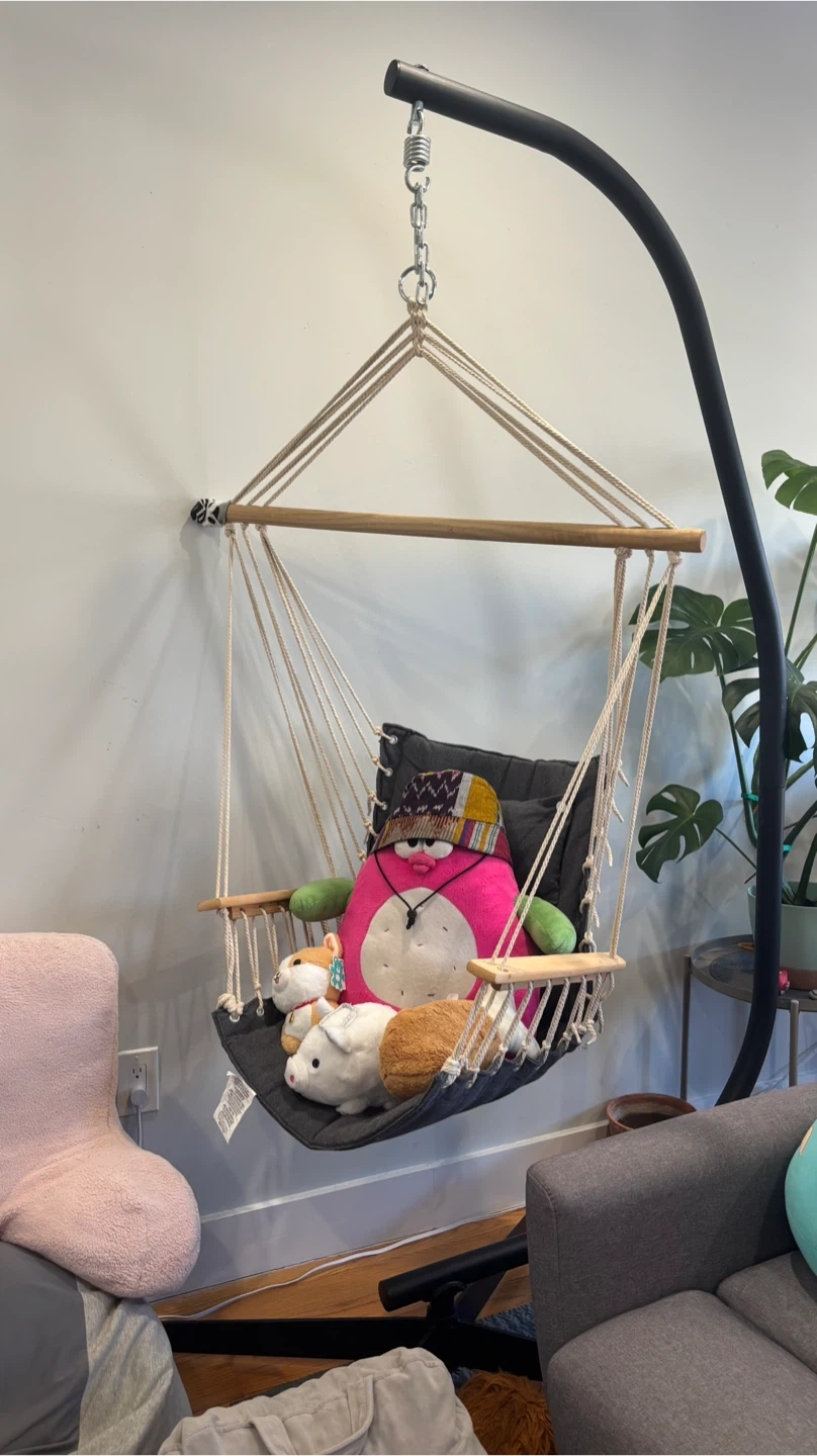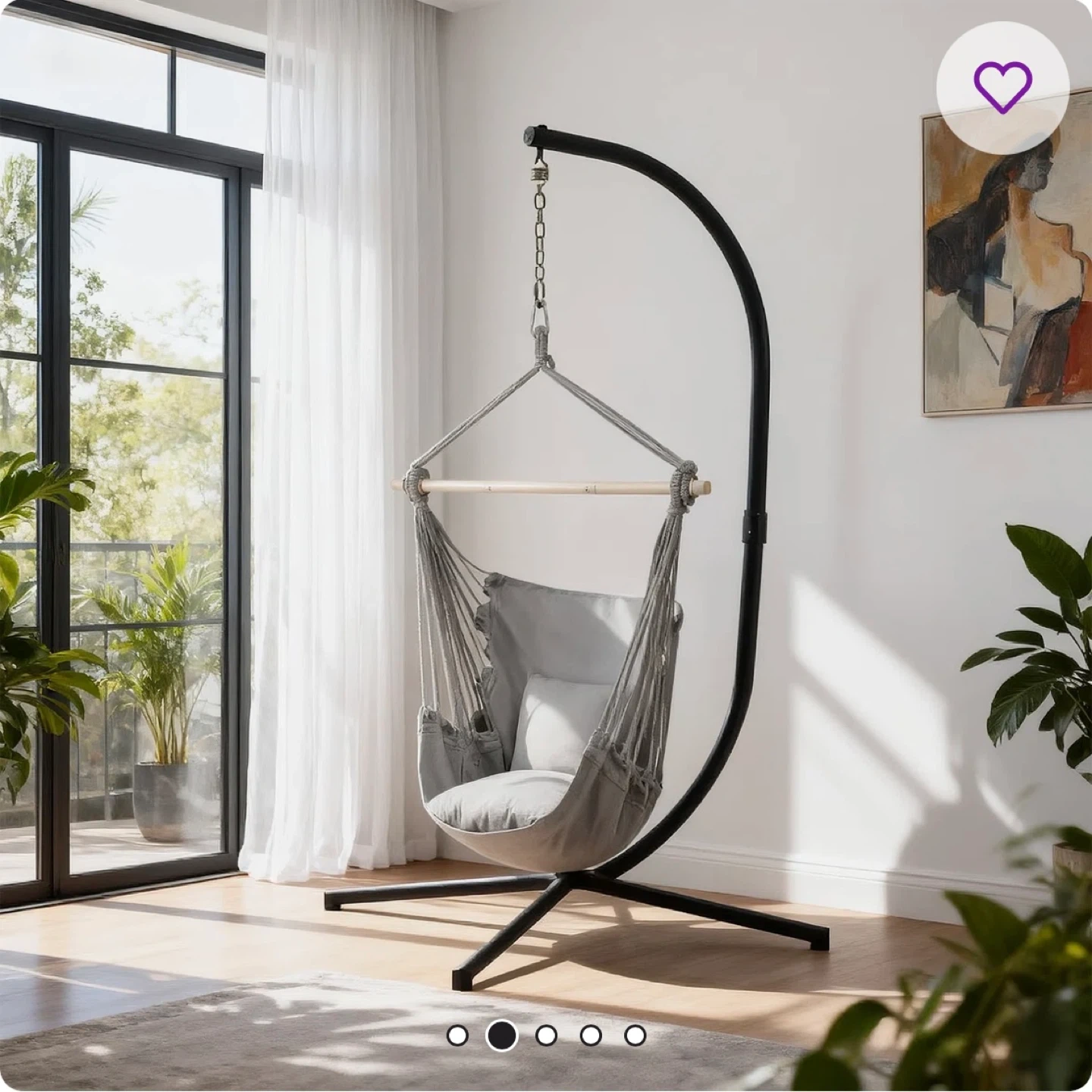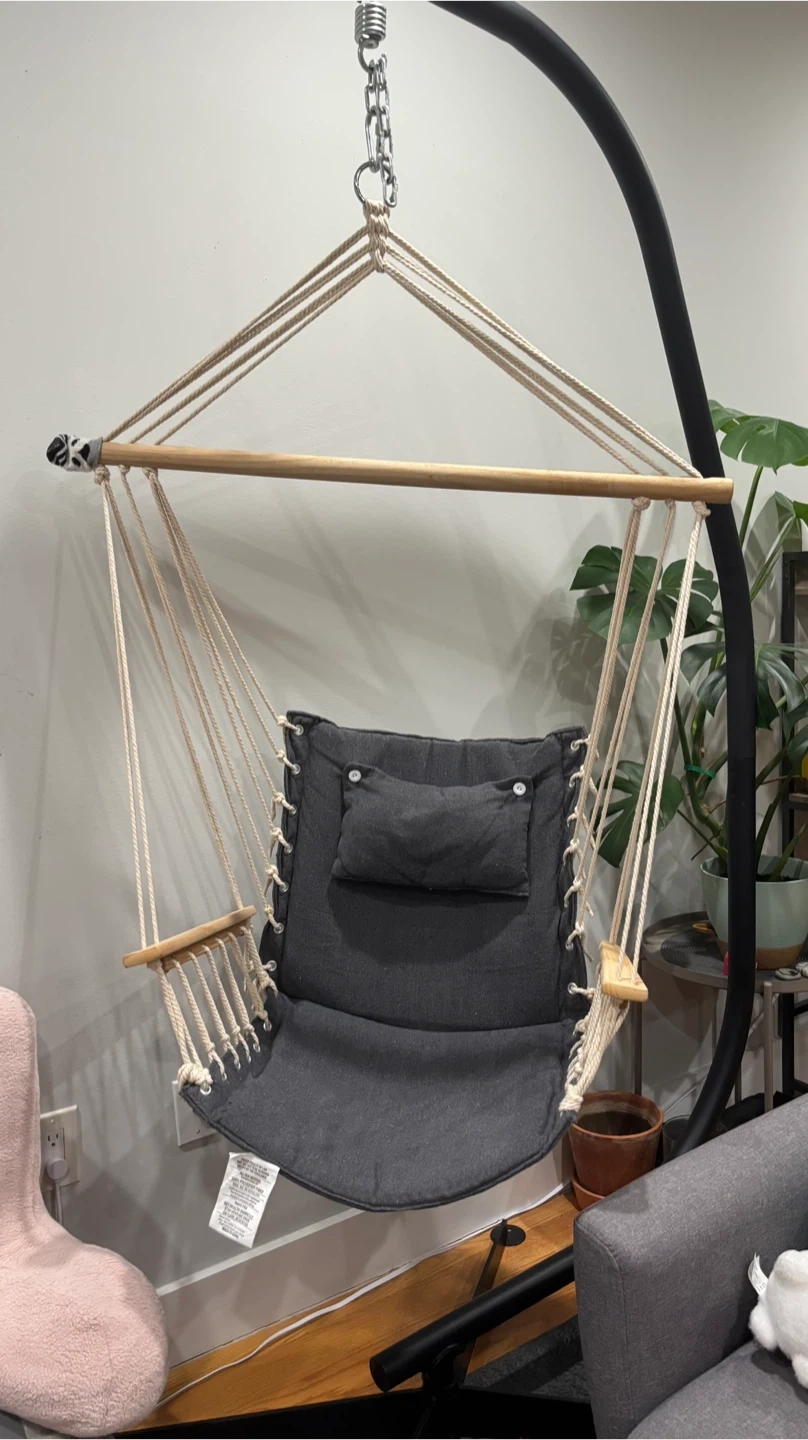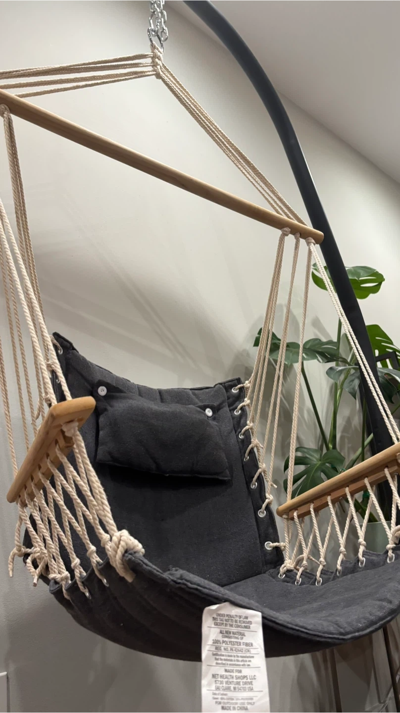 Selling this comfy fabric hammock chair with a sturdy black metal stand. It has rope suspension and the stand is heavy, so it’s very sturdy. I couldn’t find the original picture from the store but the last pic is the closest one.