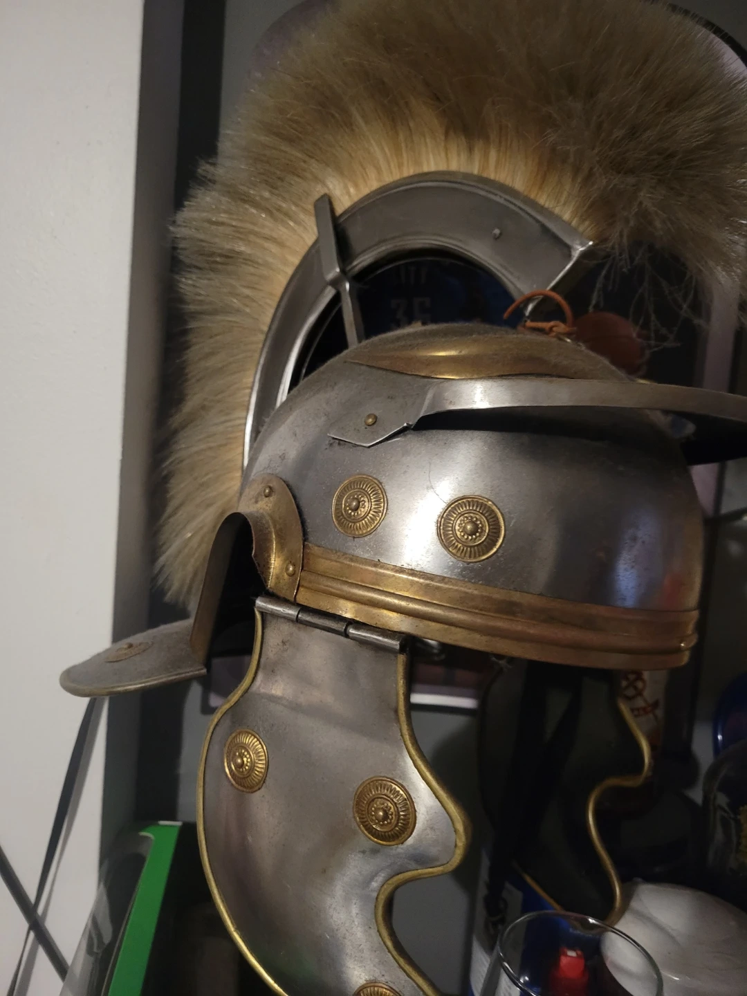 This is a replica Roman Centurion helmet. It's made of metal with brass accents and features a distinctive horsehair plume. It's a great piece for costumes or display!