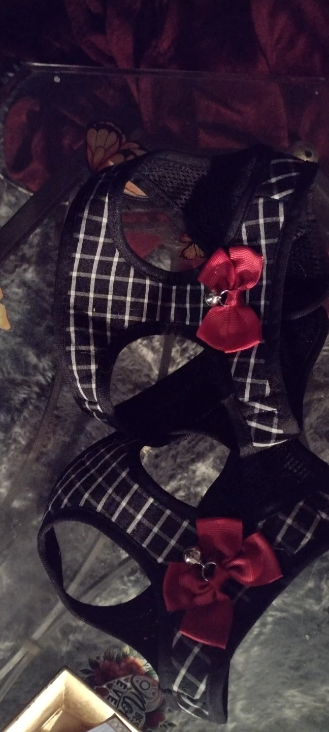 This is a pink mesh dog harness with a leash and a soft pink sweater with colourful polka dots. It's also a black and white checkered harness with red bows. Great for keeping your pup comfy and stylish! Asking $5 each. The tuxedo harness l.am selling 2/$7. These will fit Small animals only.