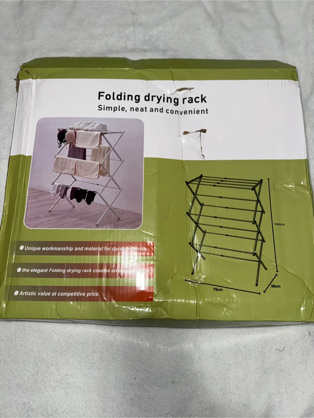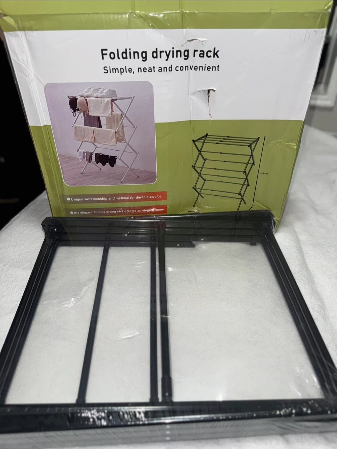 This folding drying rack is simple, neat, and convenient. It features a flexible hinge for easy expansion and non-slip foot covers that protect your floor. It's foldable for easy storage. Dimensions are 75cm x 38cm x 105cm.