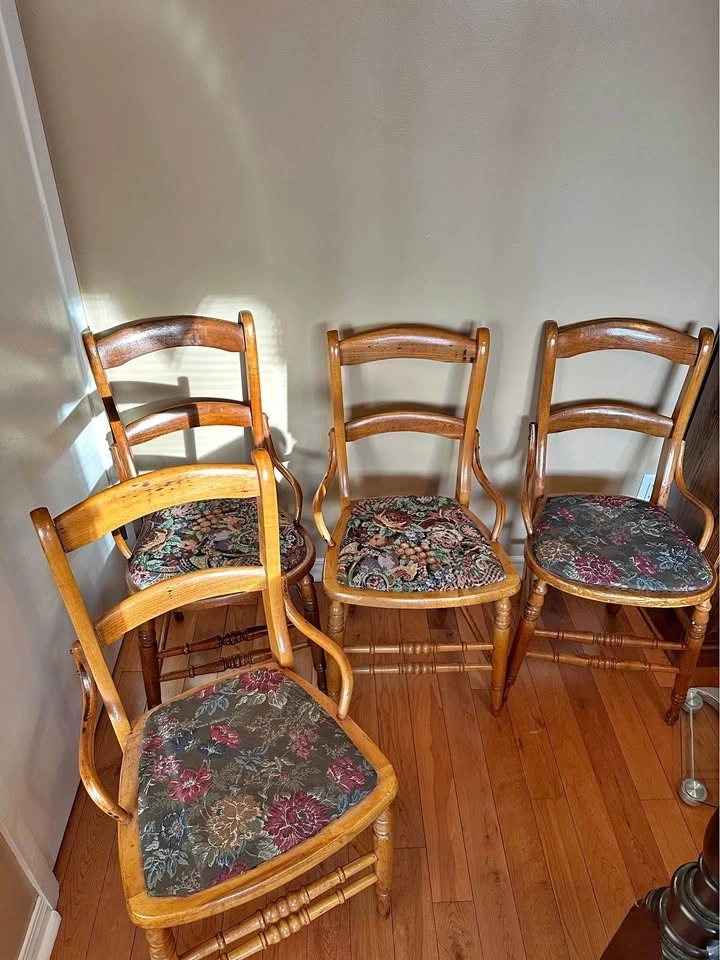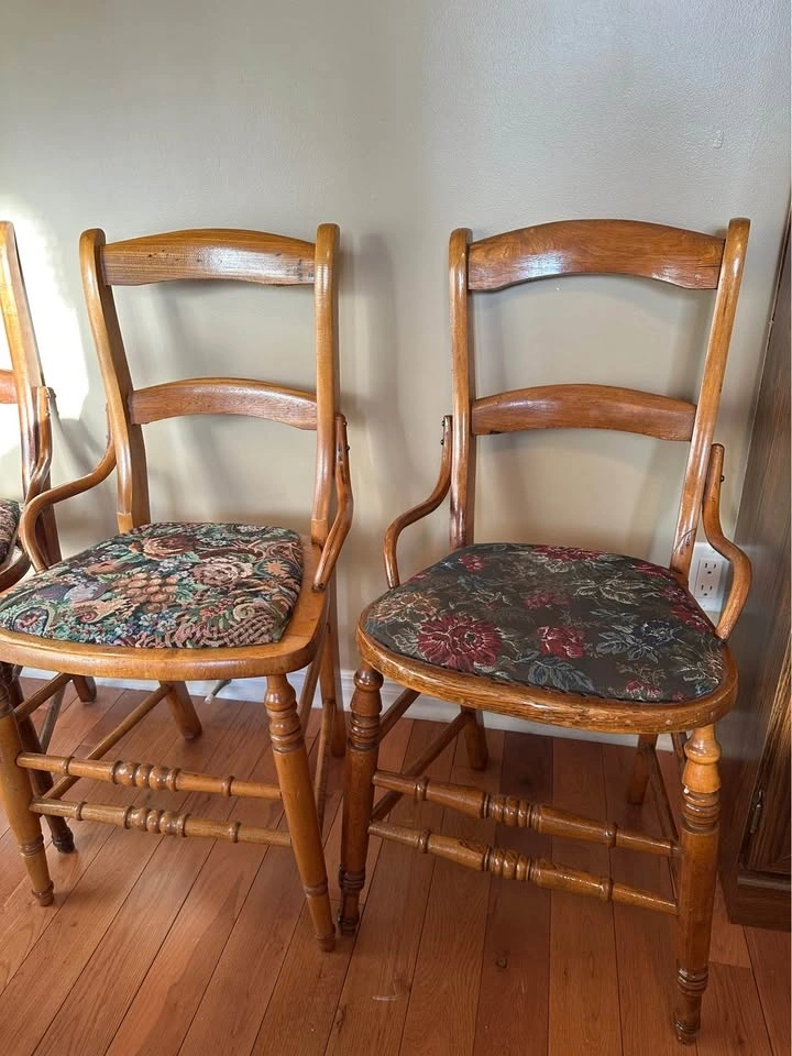 Two antique Victorian Eastlake parlor accent chairs made of maple. Features ladderback design with low arms, turned posts, and needlepoint seats. Dimensions: 19"L x 17"W. Let me know if you're interested!