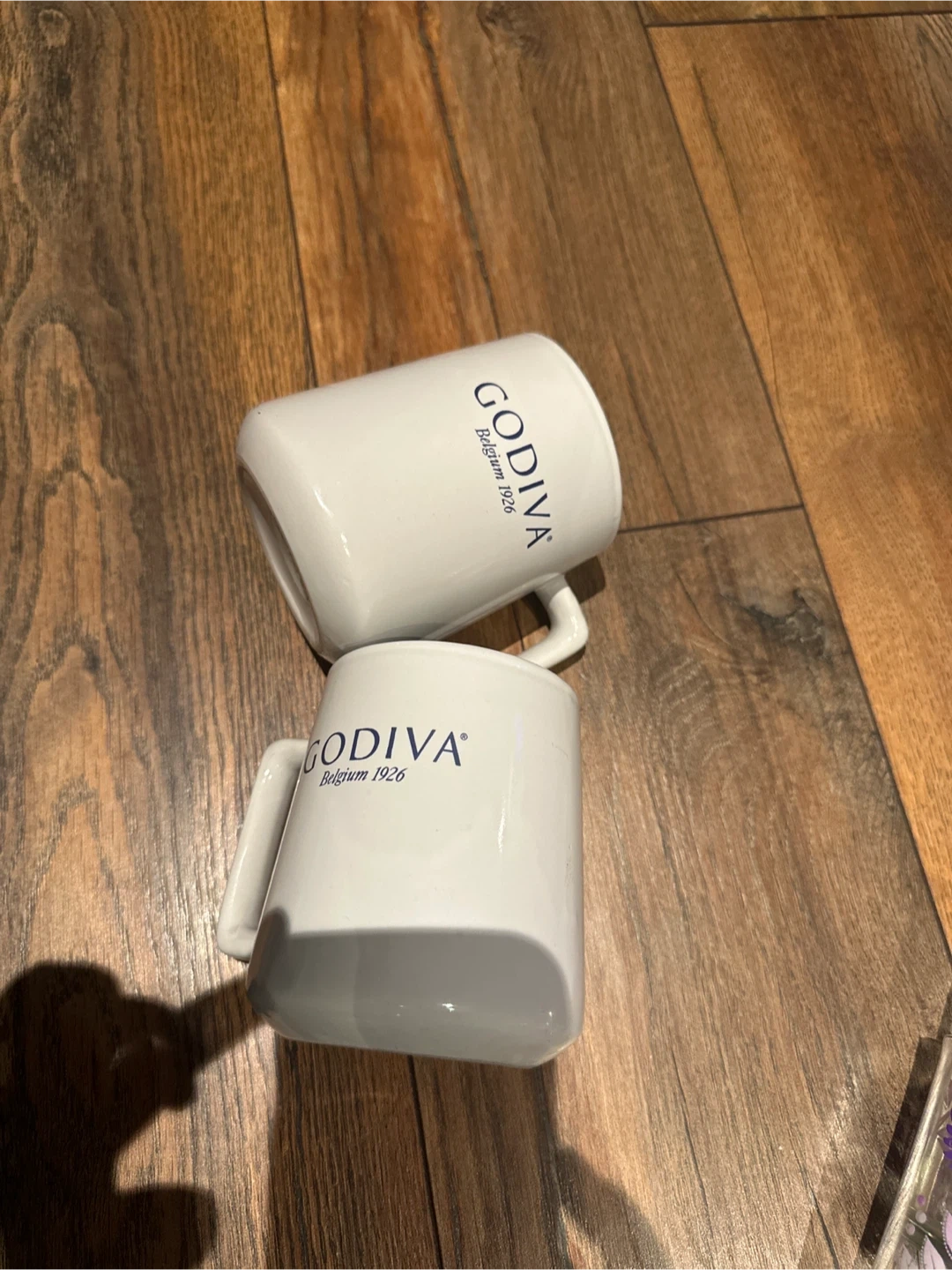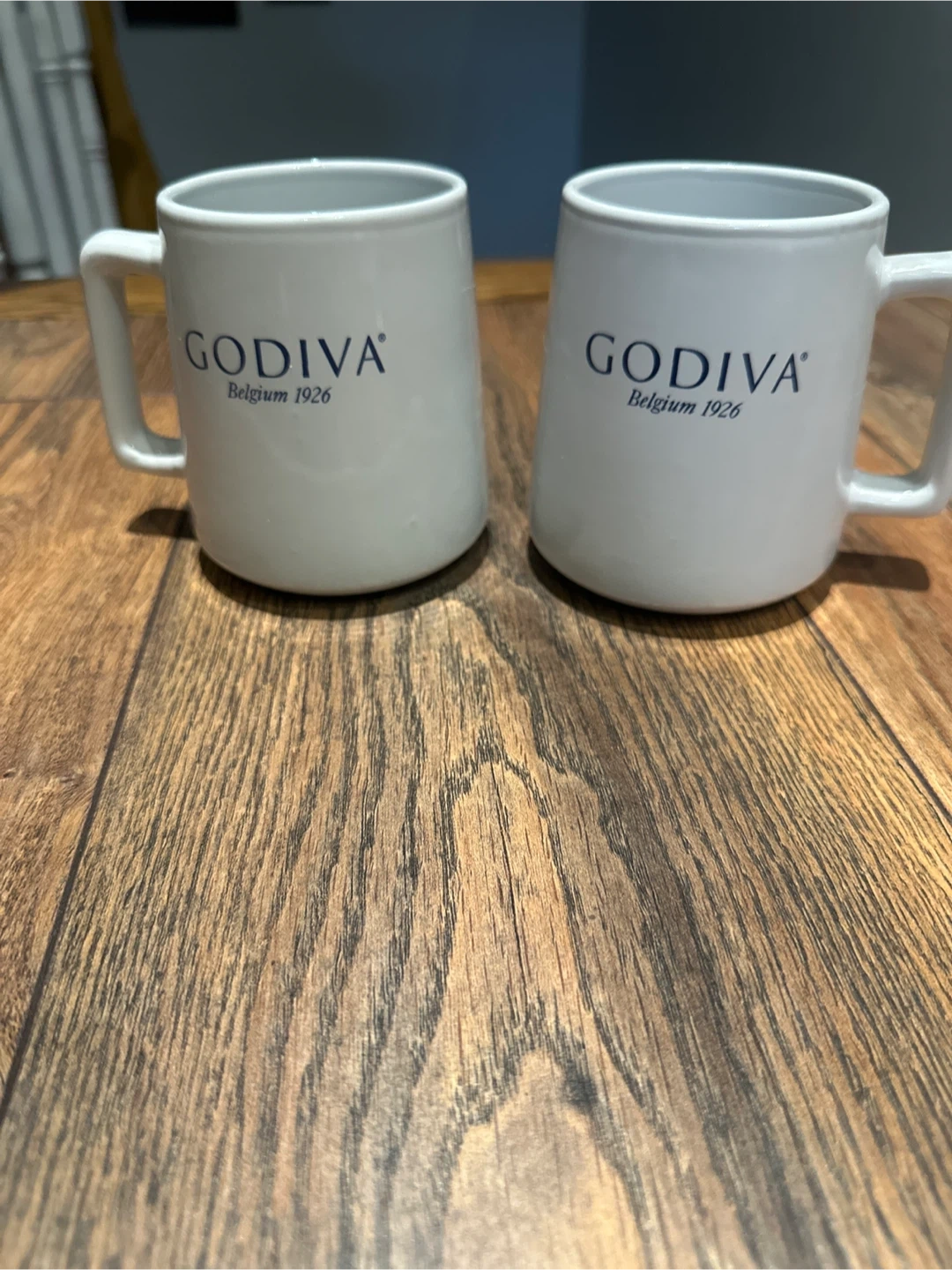 This is a set of two white ceramic mugs featuring the Godiva "Belgium 1926" logo. They're a classic design for enjoying your favourite hot beverage.