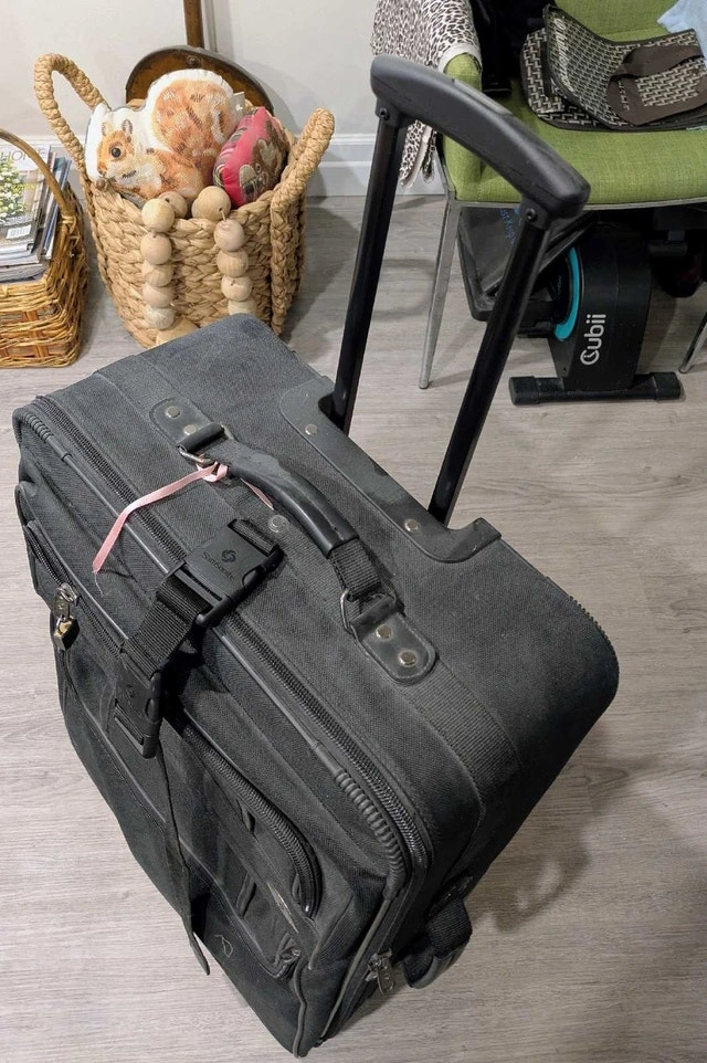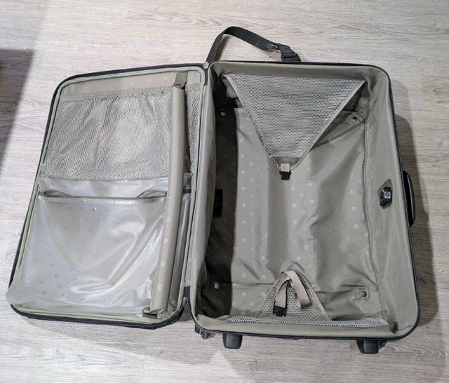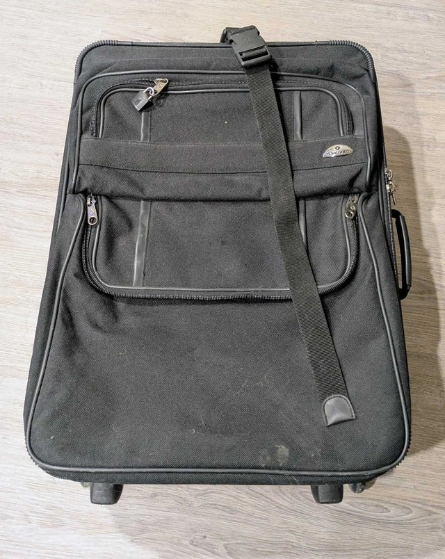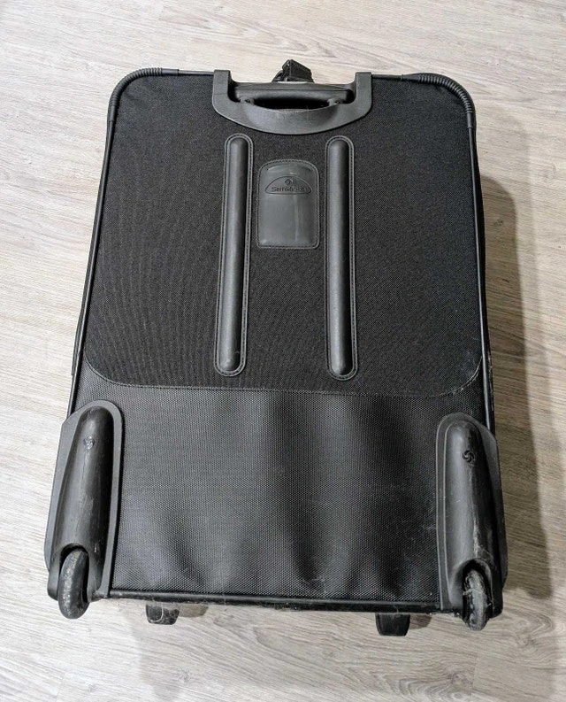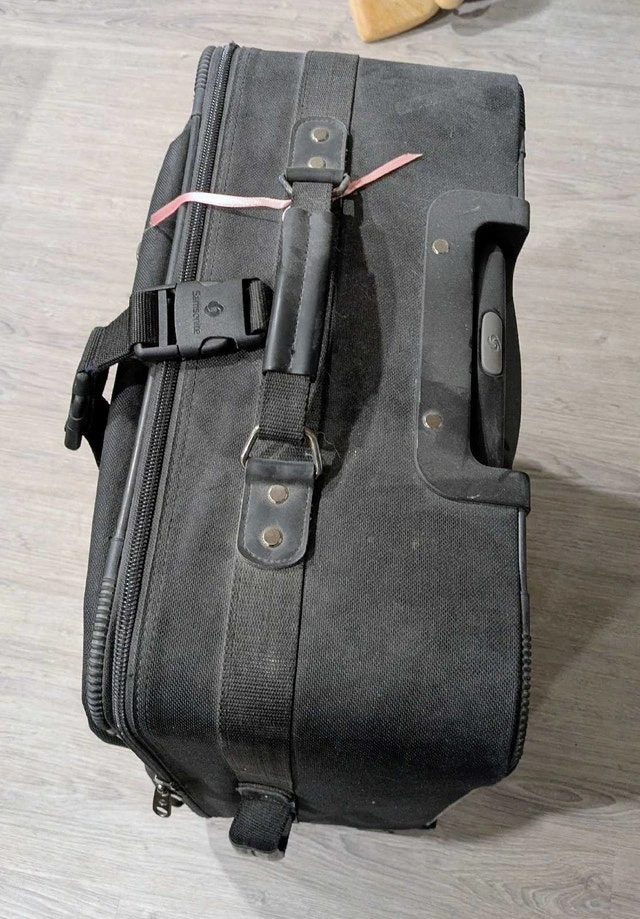 This Samsonite checked luggage bag has a retractable handle and wheels for easy maneuverability. It's a great size for long trips with ample storage and multiple compartments for organized packing, making it a reliable travel companion. Please note that this luggage has been used and shows signs of wear but remains fully functional. It measures about 28" high x 18" wide x 9" deep. If the ad is up, the item is still available and waiting for its next adventure!