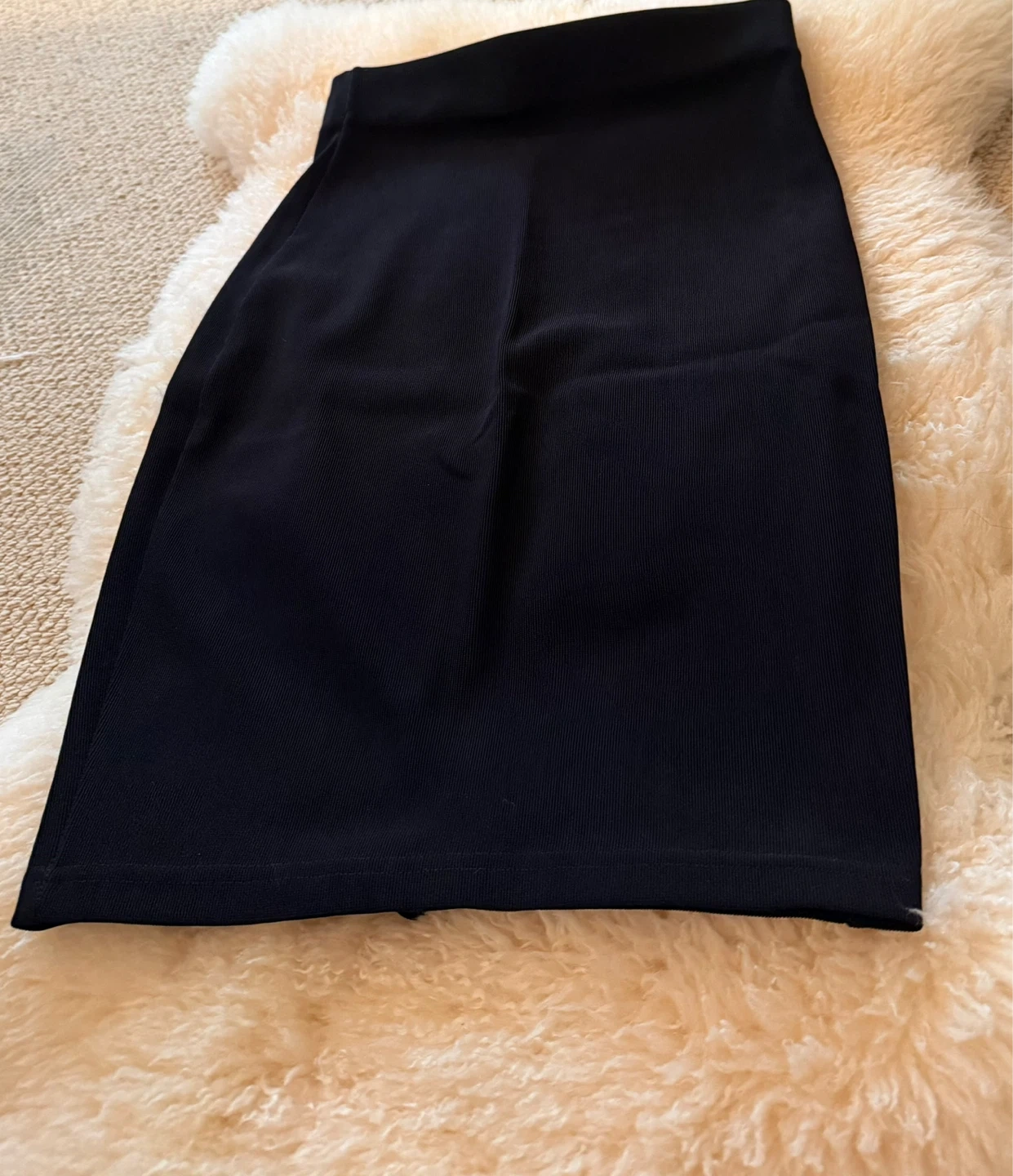 Dark navy blue skirt 100 polyester , size 6 Jessica , lined , waist 70 cm , length 52 cm , small slits on each side, one small fake pocket at the back.