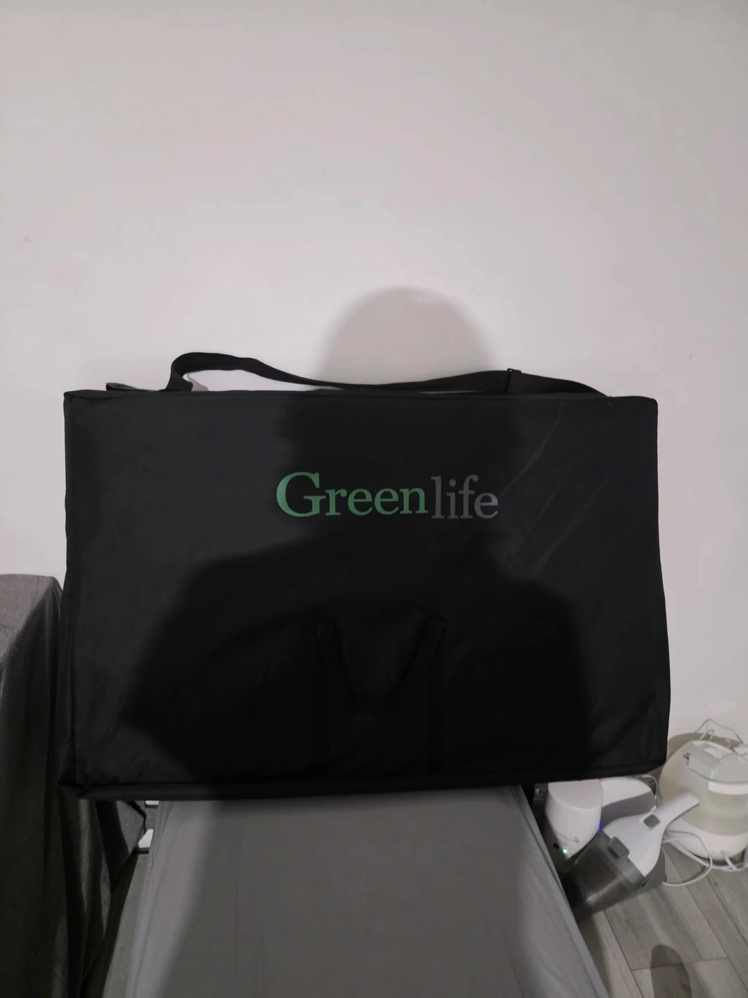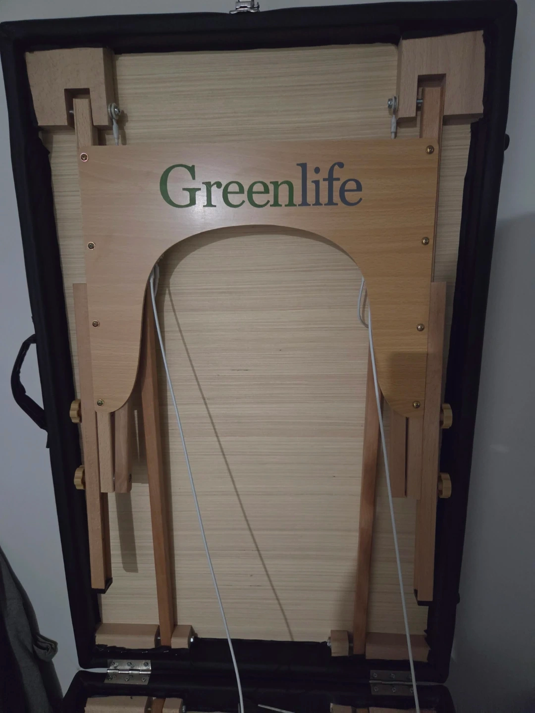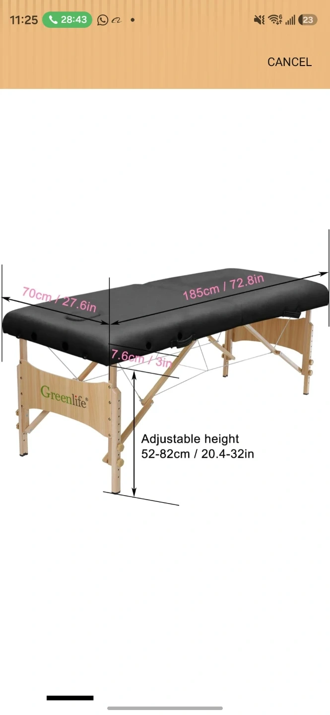 This is a Greenlife portable massage table. It has a face cradle and adjustable height. The table measures 185cm long and 70cm wide. The adjustable height ranges from 52cm to 82cm.