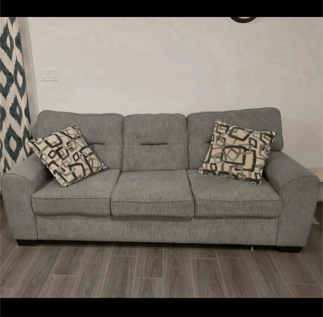 This is a comfortable three-seater sofa upholstered in a textured grey fabric. It includes two matching decorative pillows with a modern geometric pattern. The sofa has clean lines and a simple silhouette.