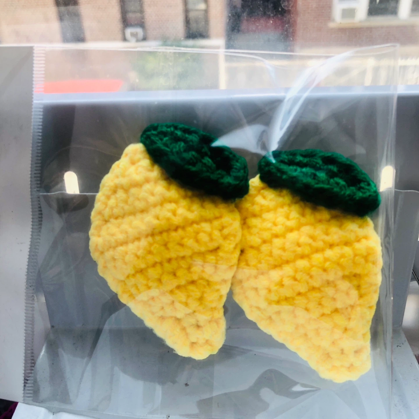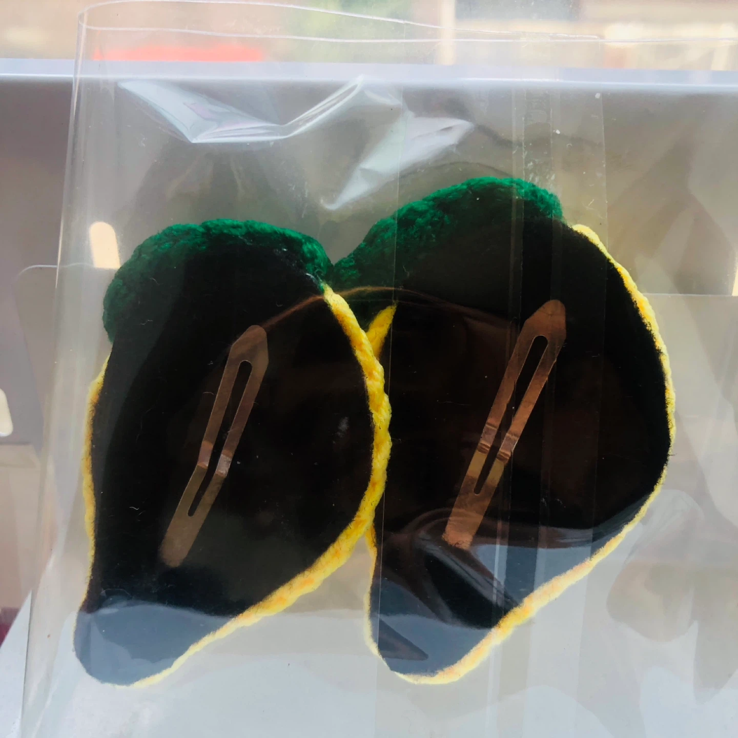 Adorable set of two handmade crocheted lemon-shaped hair clips. These bright yellow clips feature green leaf accents and secure with sturdy metal clasps. They're perfect for adding a touch of fun to any hairstyle!