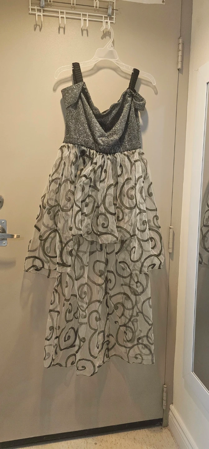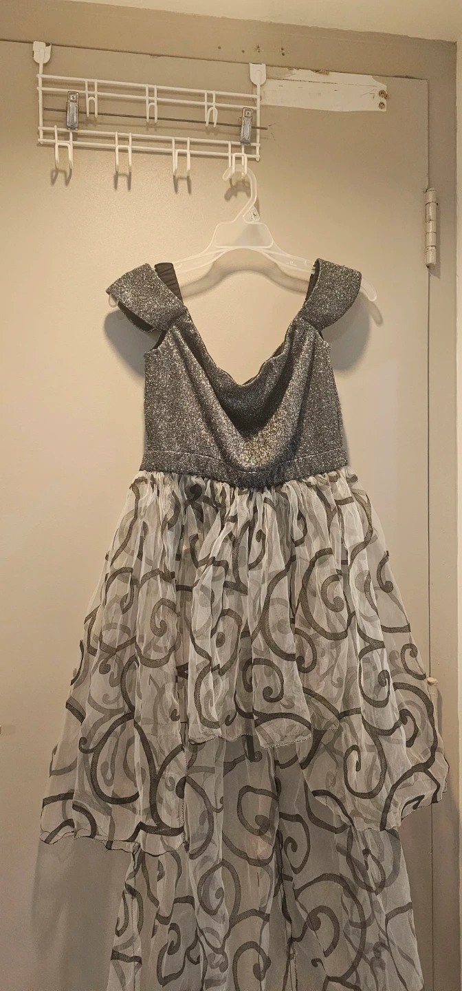 This sparkly off-shoulder dress features a glittery bodice and a tiered, sheer skirt with a swirl pattern. It has a corset-style lace-up back for adjustable fitting. Perfect for special occasions!