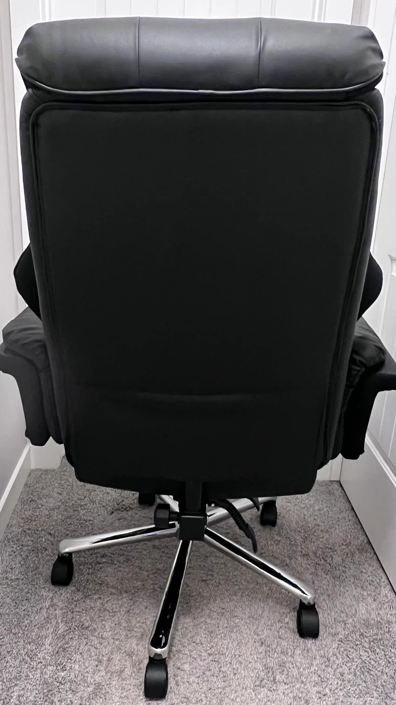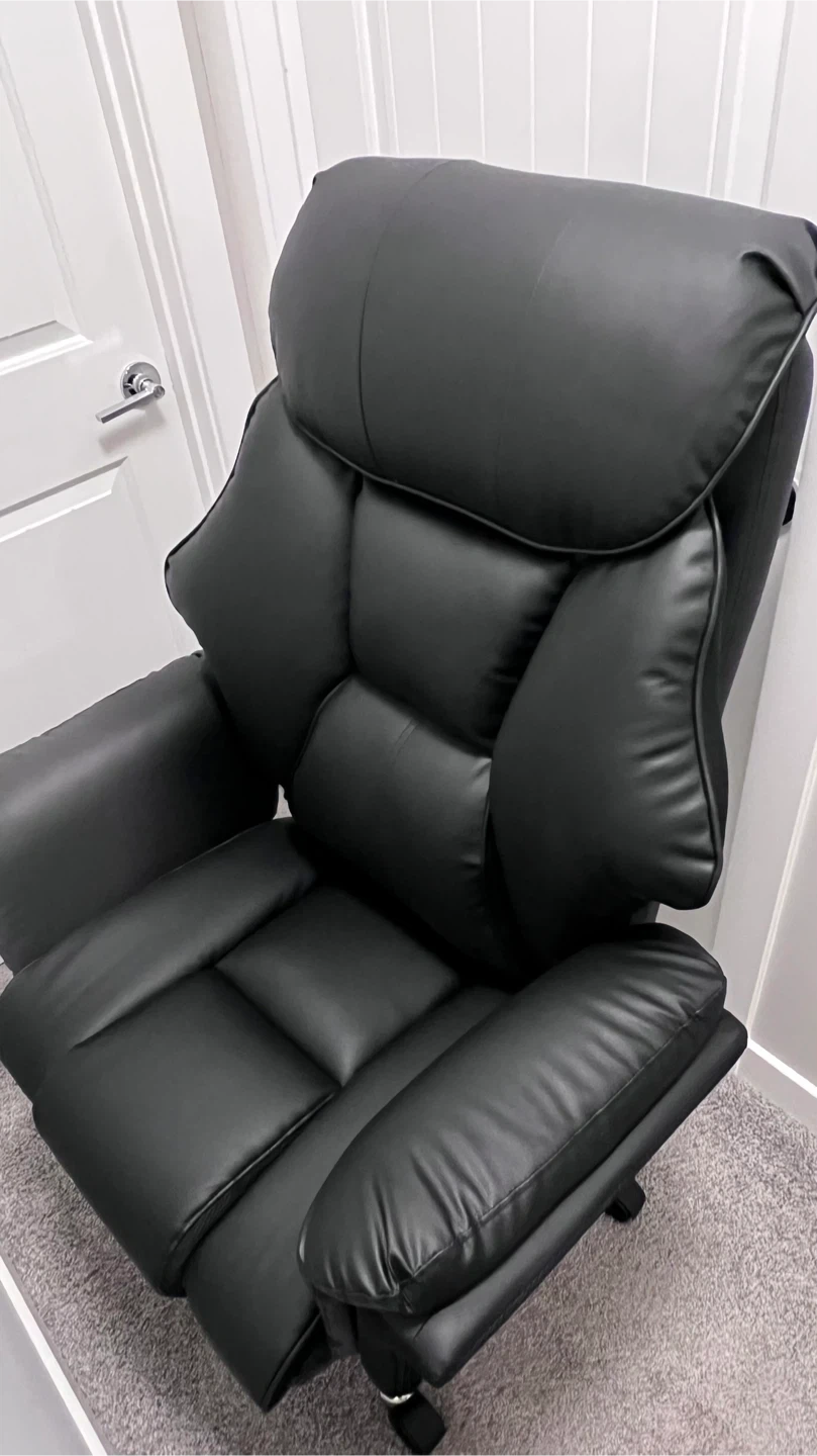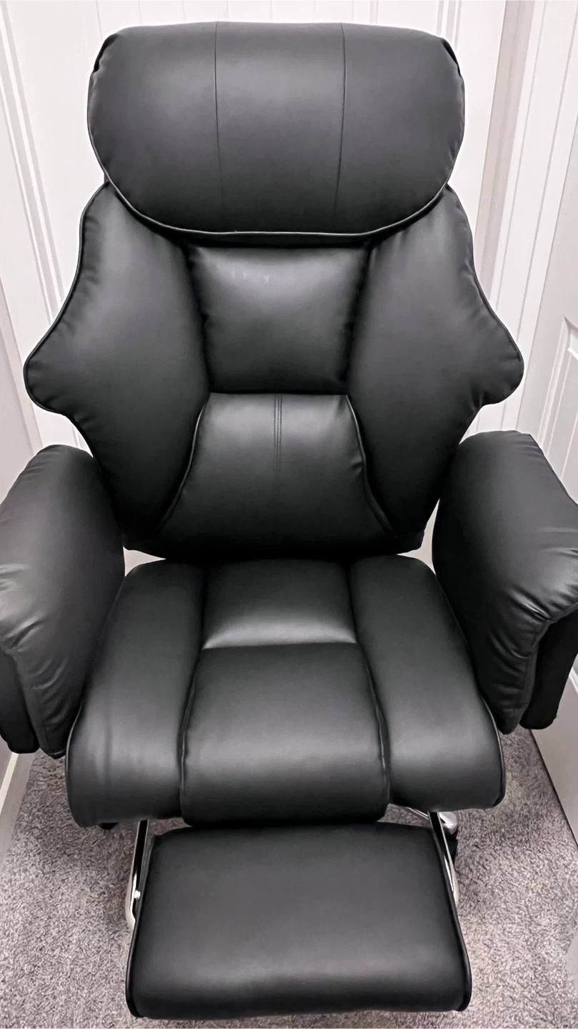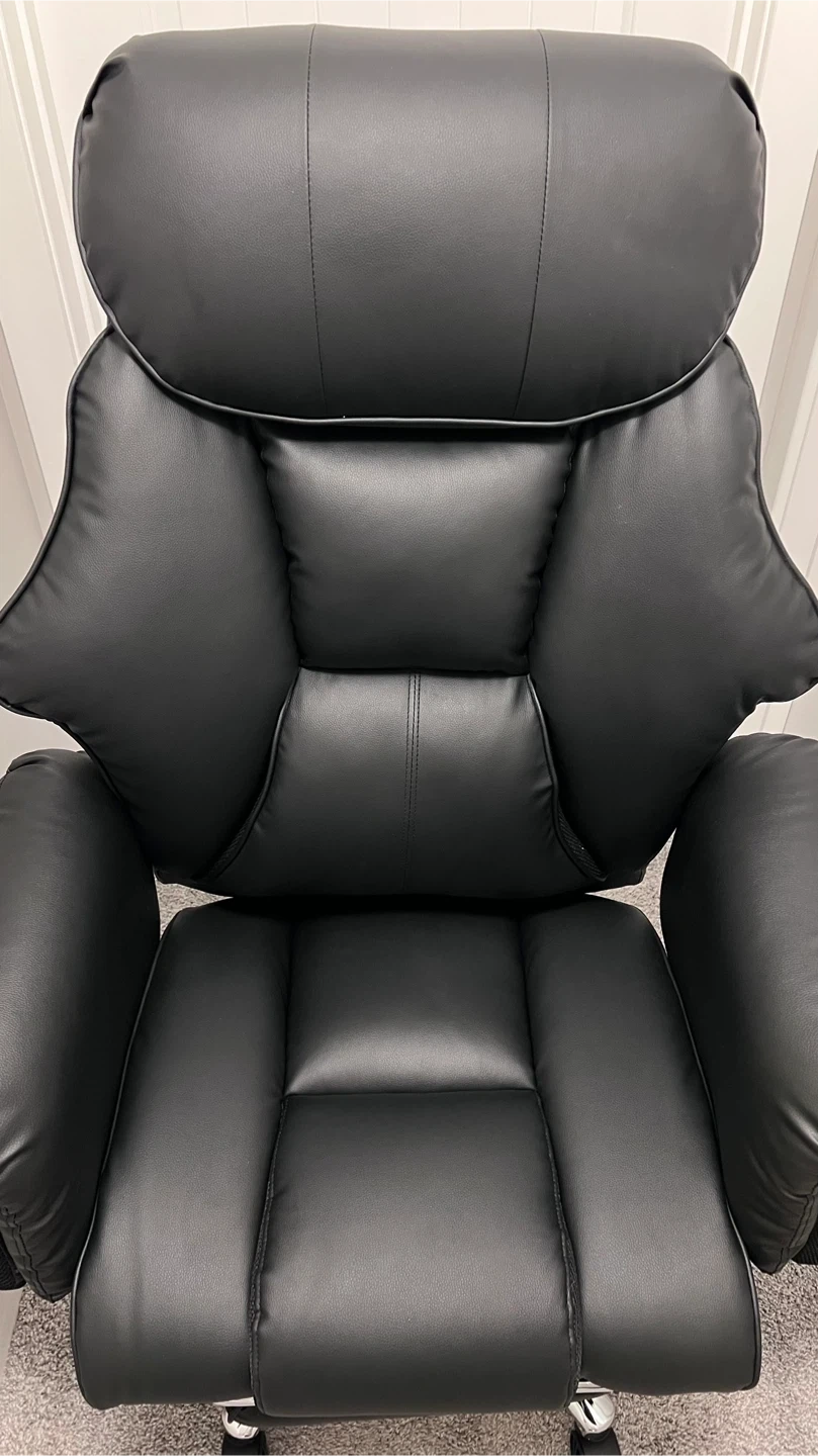 Brand new! We’ve just assembled it! Too large for us, however, this ergonomic executive office chair is super comfortable! It's upholstered in black faux leather with a built-in footrest. The chair has a sturdy chrome base. It is brand new, we only tested it.