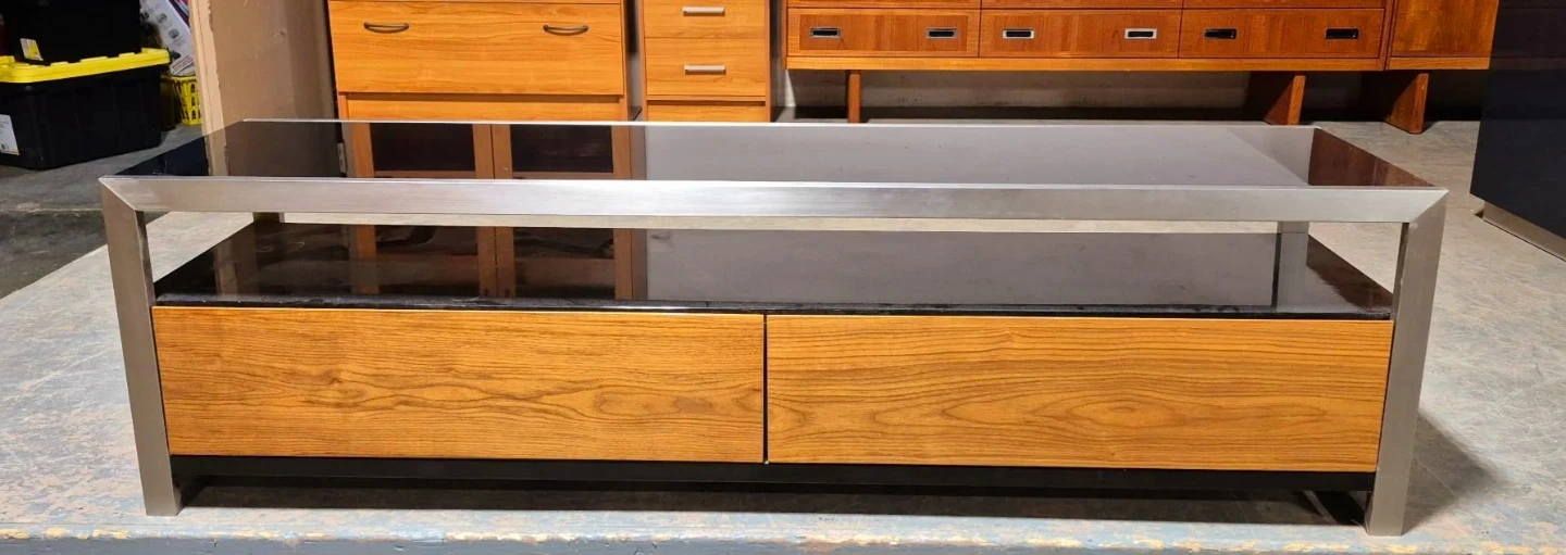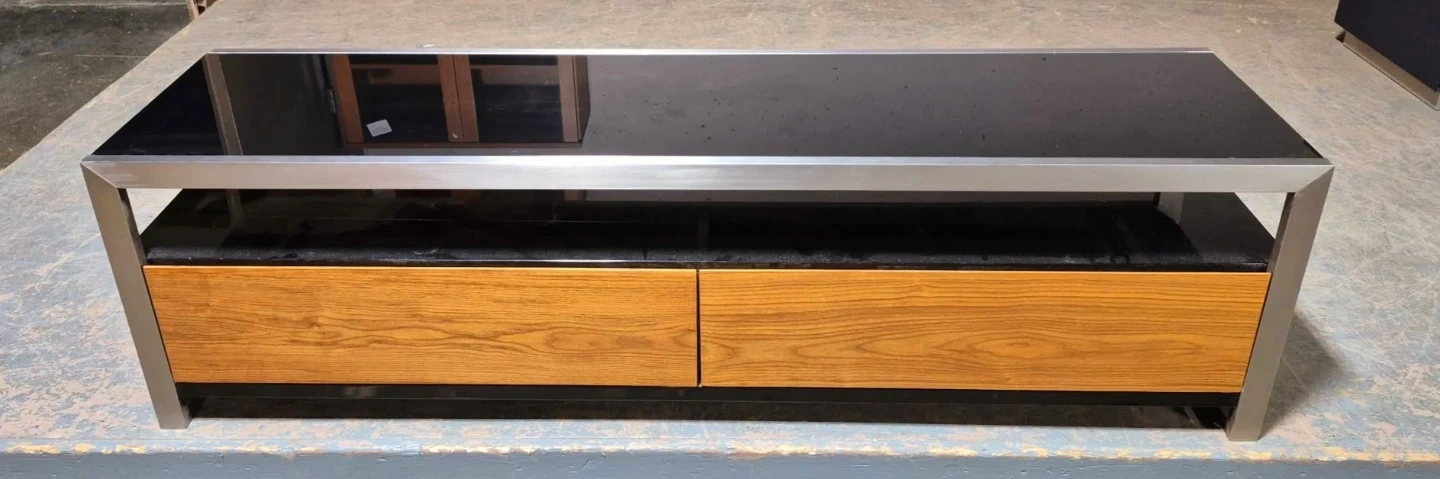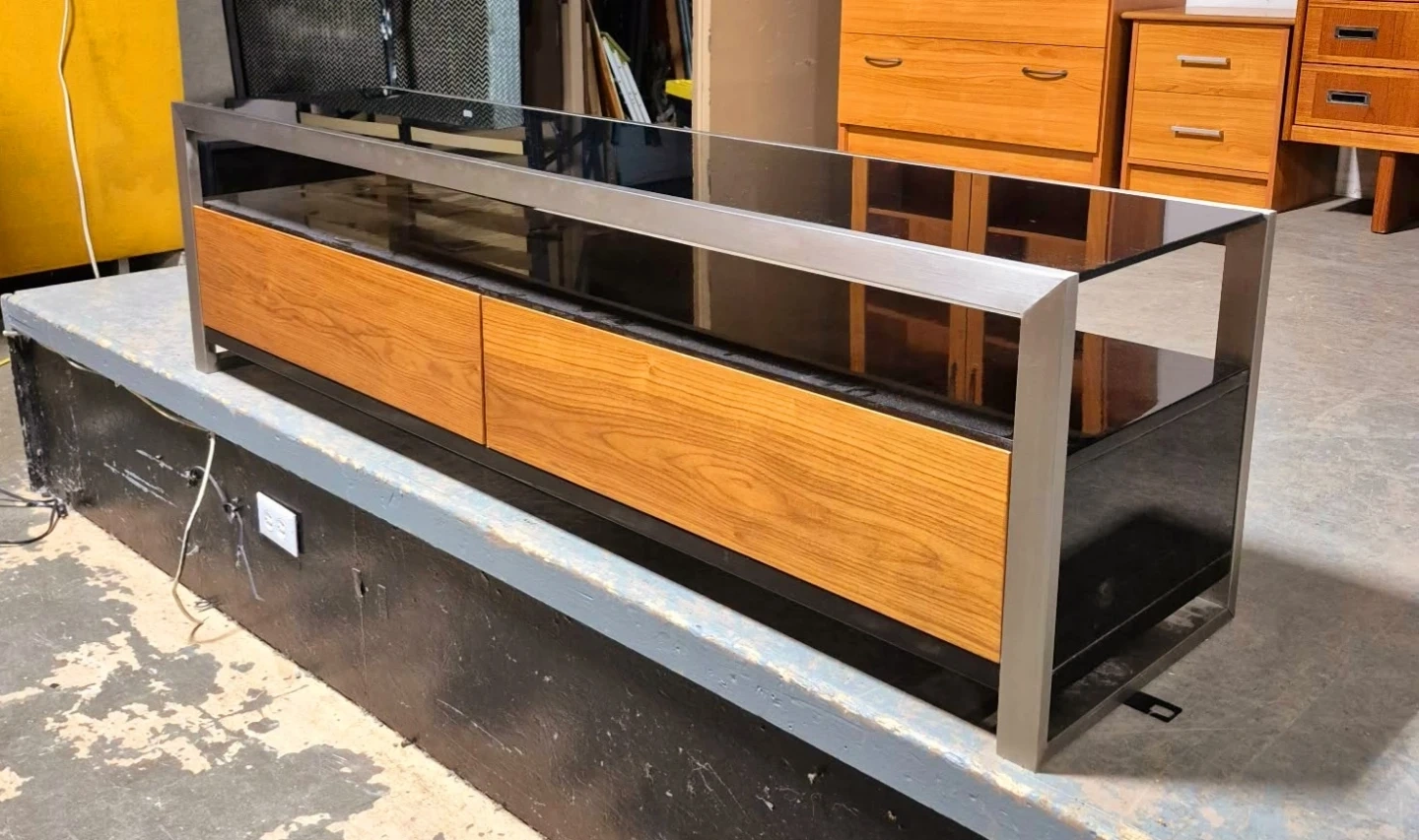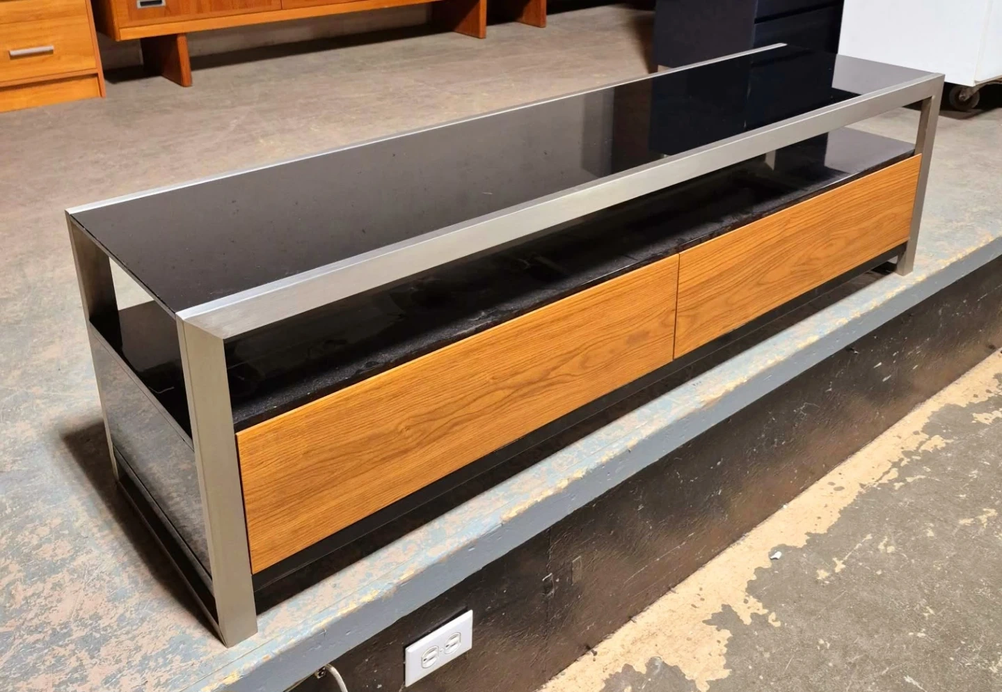 MCM Style Tinted Glass Tv Stand With Two Wooden Drawers (Delivery Available)