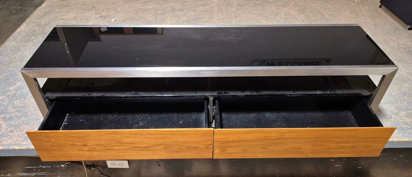 MCM Style Tinted Glass Tv Stand With Two Wooden Drawers
