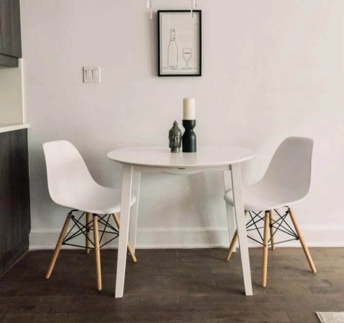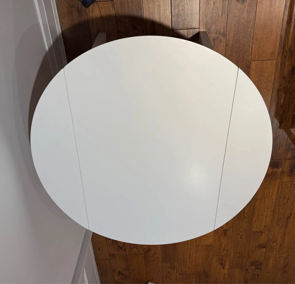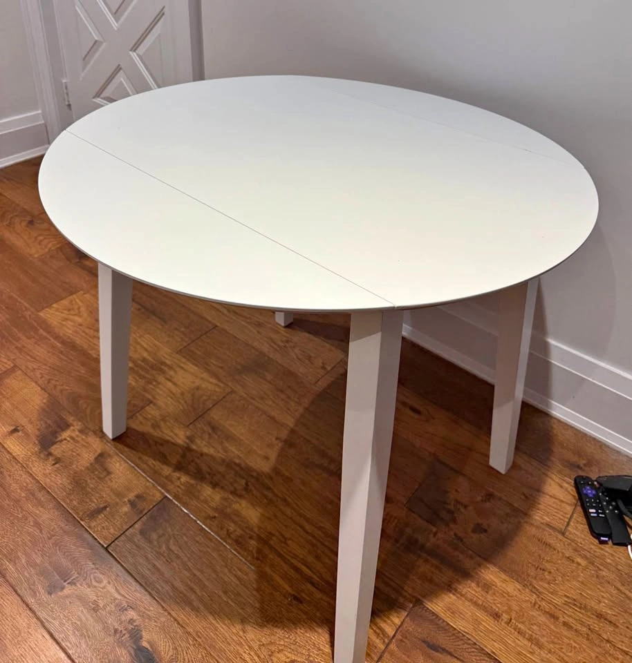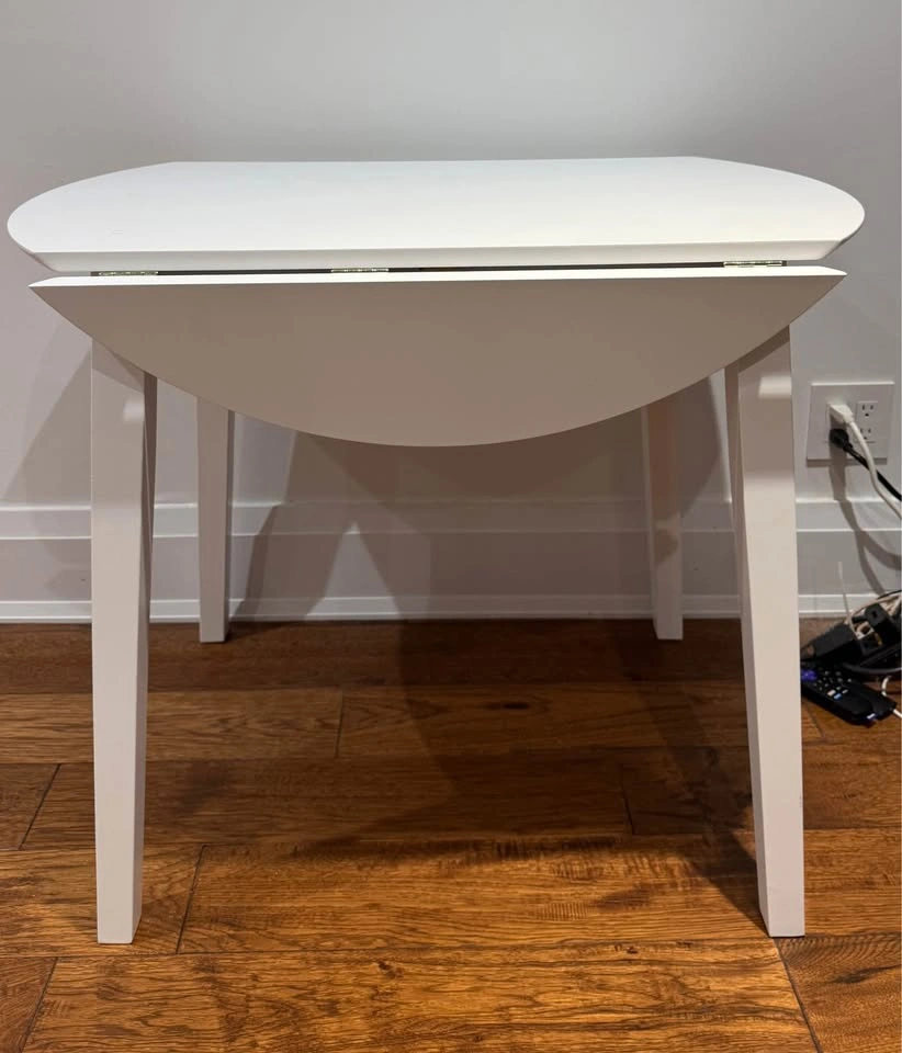 New, used for staging. Perfect for a condo or small space. Seats 2 but can fit 4 when leaves are extended. Measuring 90 x 73.8 x 90 cm (35.4 x 29.1 x 35.4") when extended. Sells for $199+tax. Flexible pick up in Aurora (404/Aurora Rd) or North York. Currently disassembled (legs not attached to table) to make it easier to move!