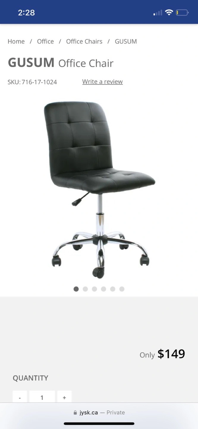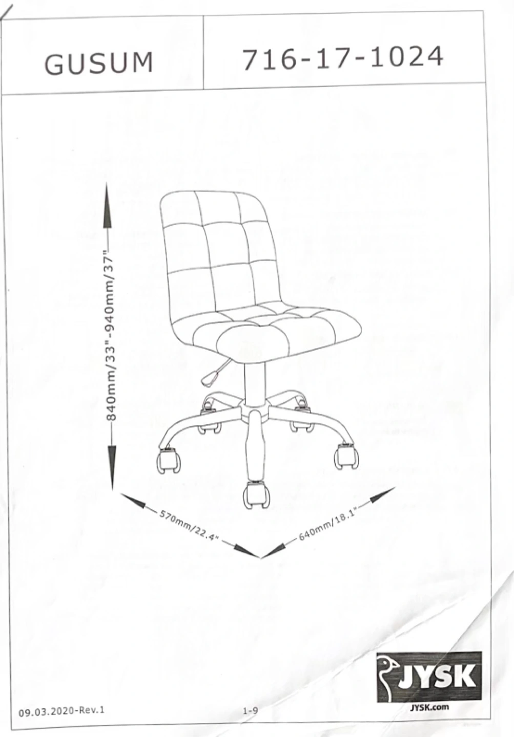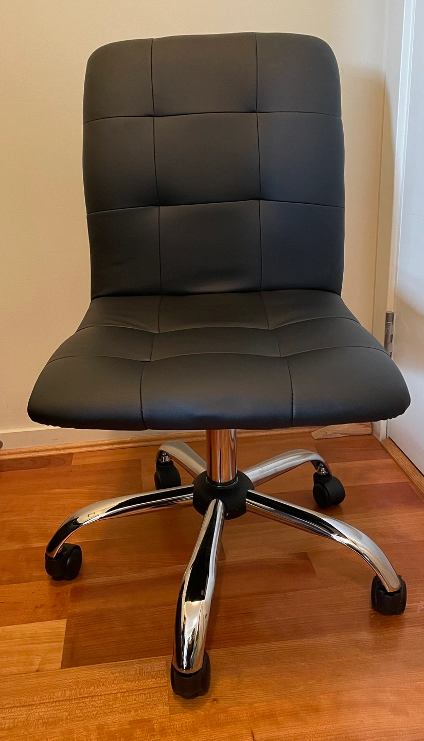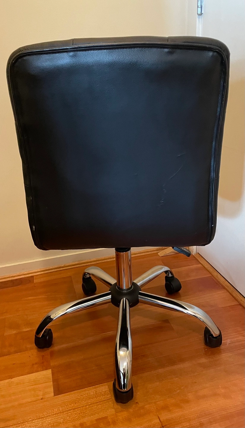 17Faux leather tufted chair. Used, like new. Slight cosmetic imperfections on the back (brought through a narrow doorway). Moves up and down only. Would be good for a small desk. Specifications in the diagram on the booklet.